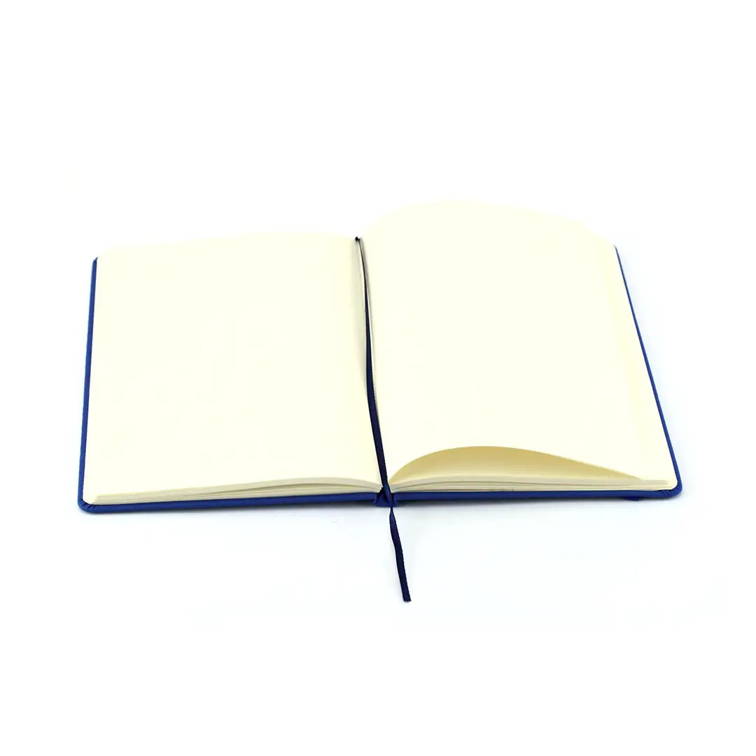 Bloc de notas A5 con tapas duras fabricado en suave polipiel y con 100 hojas lisas. Incluye marcapáginas de tela y banda elástica a juego. Disponible en una extensa gama de colores.