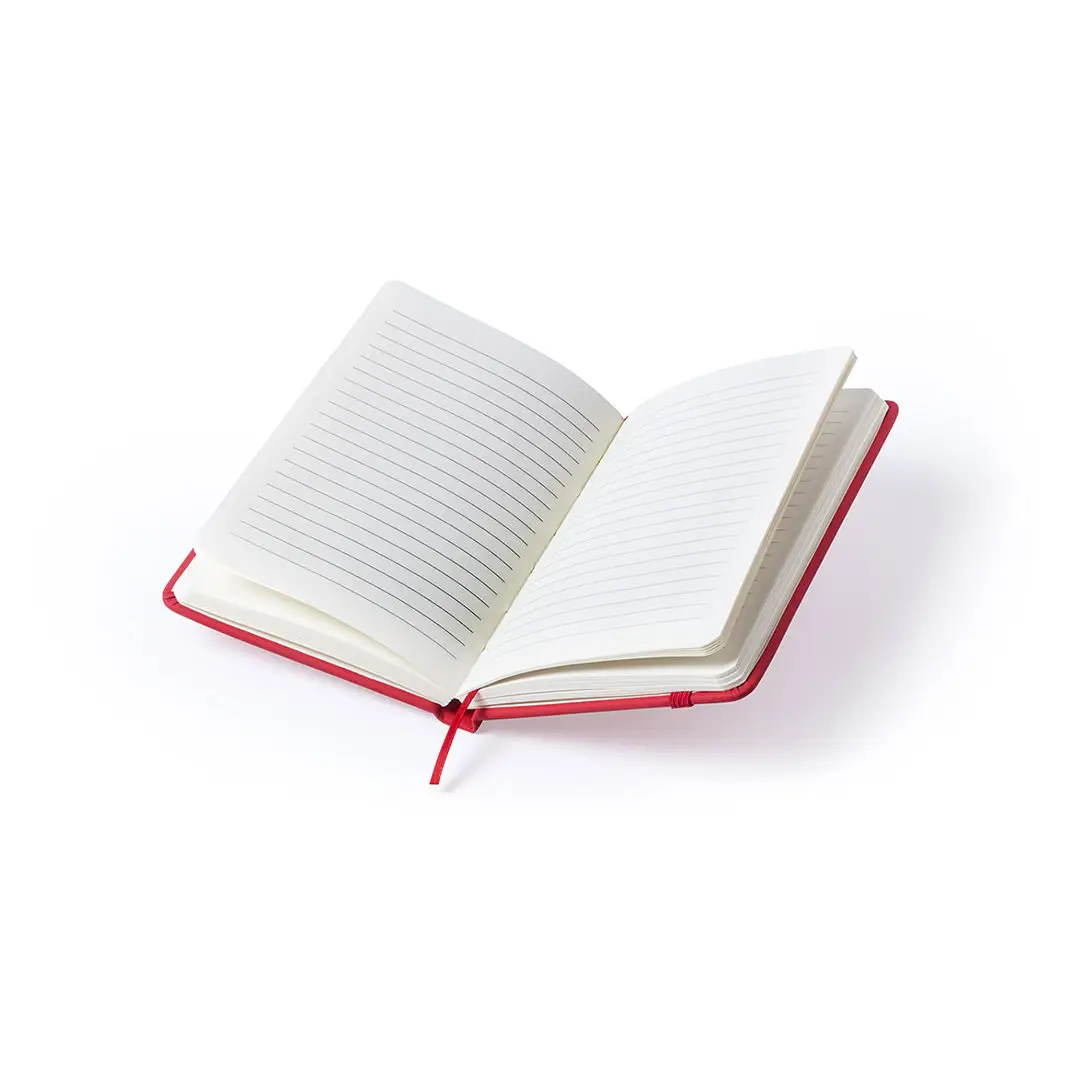 Bloc de notas con tapas de suave tacto, acabado en polipiel y en desenfadados colores. Con 100 hojas de distribución a una raya, elástico de sujeción y marcapáginas de tela a juego.