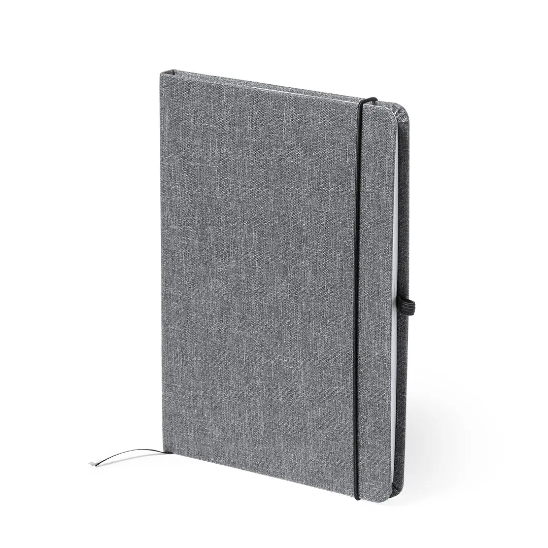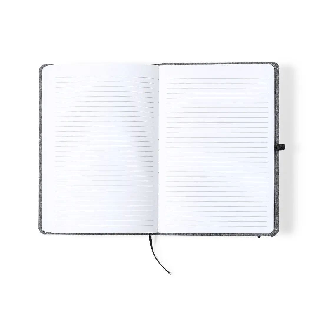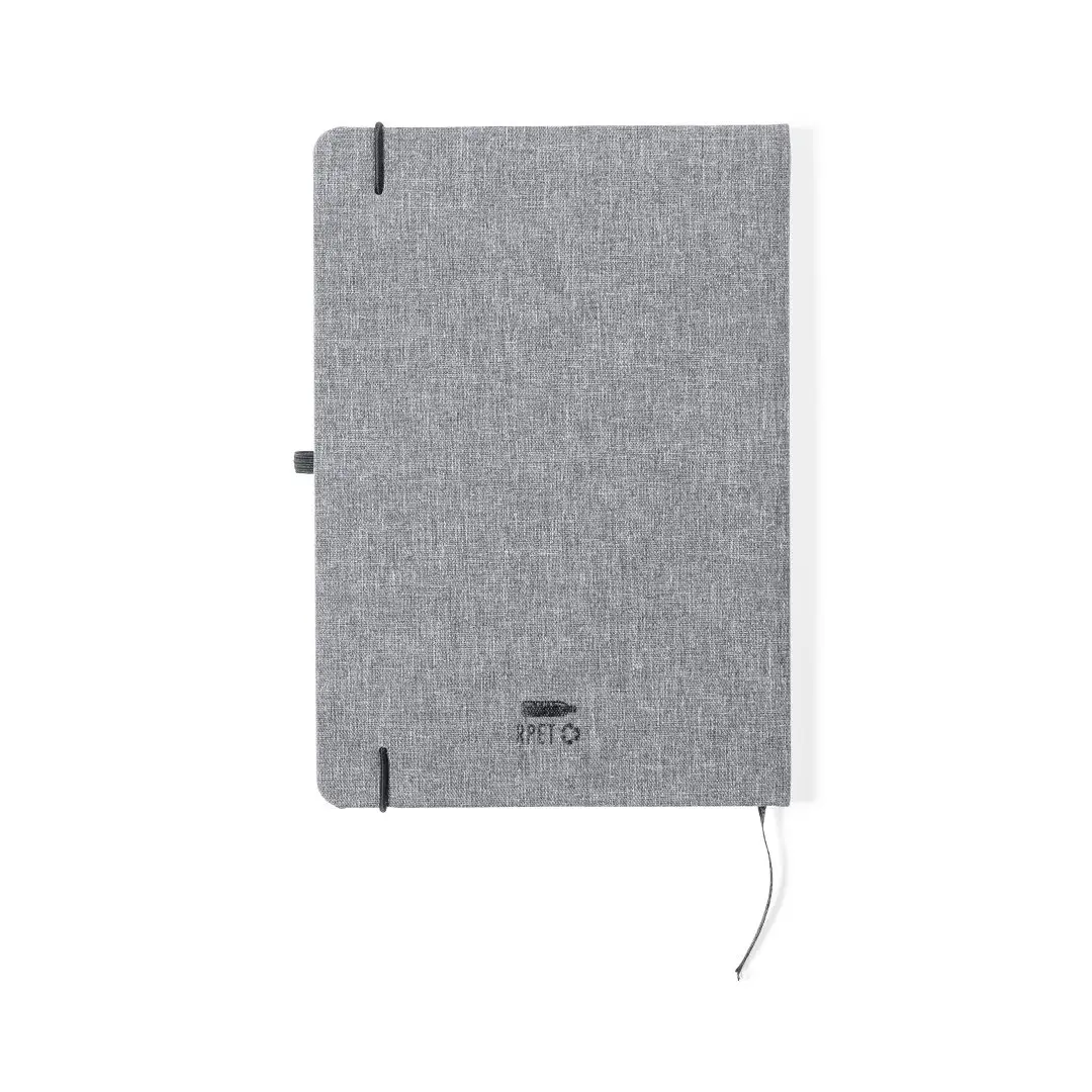 Bloc de notas de línea nature. Con tapas rígidas fabricadas en RPET, elaborado a partir de plástico reciclado, para así fomentar la reutilización de residuos plásticos y ayudar a la sostenibilidad del planeta. Interior con 100 hojas de disposición a una raya. Incluye marcapáginas, elástico de cierre y soporte para bolígrafo a juego. incluye distintivo RPET en contraportada.