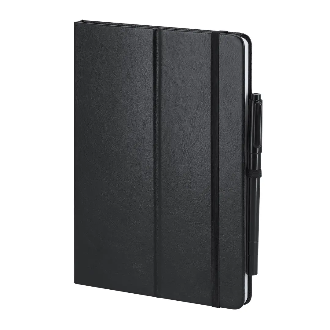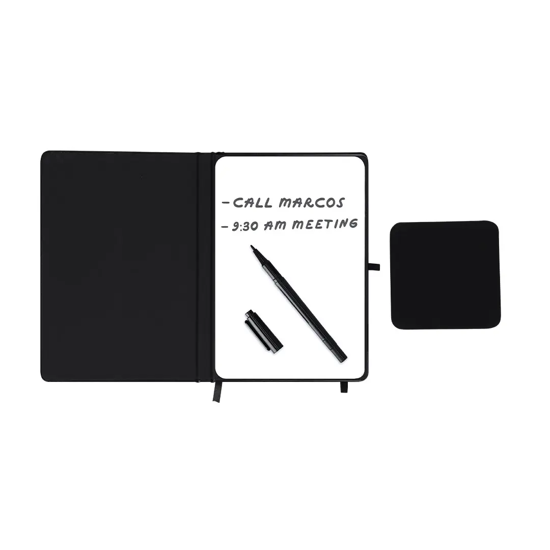 Bloc de notas pizarra en PU reciclado. Con pizarra en primera página, incluye bolígrafo rotulador y borrador en tinta negra. Con 80 hojas a disposición de una raya. Portada plegable con función soporte, y cinta elástica para cierre seguro.Ideal para tomar notas rápidas, apuntes, crear diseños en tu jornada laboral o en casa.Incluye distintitov logo PU Reciclado.