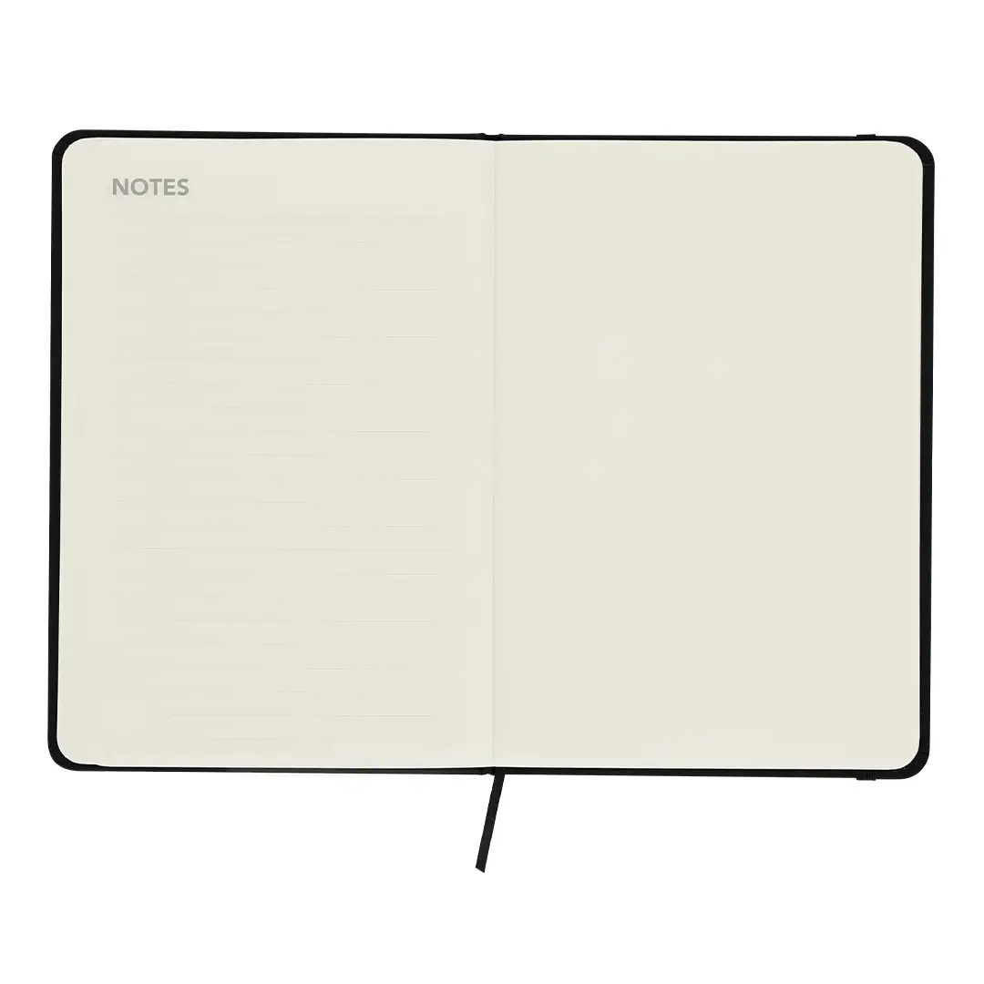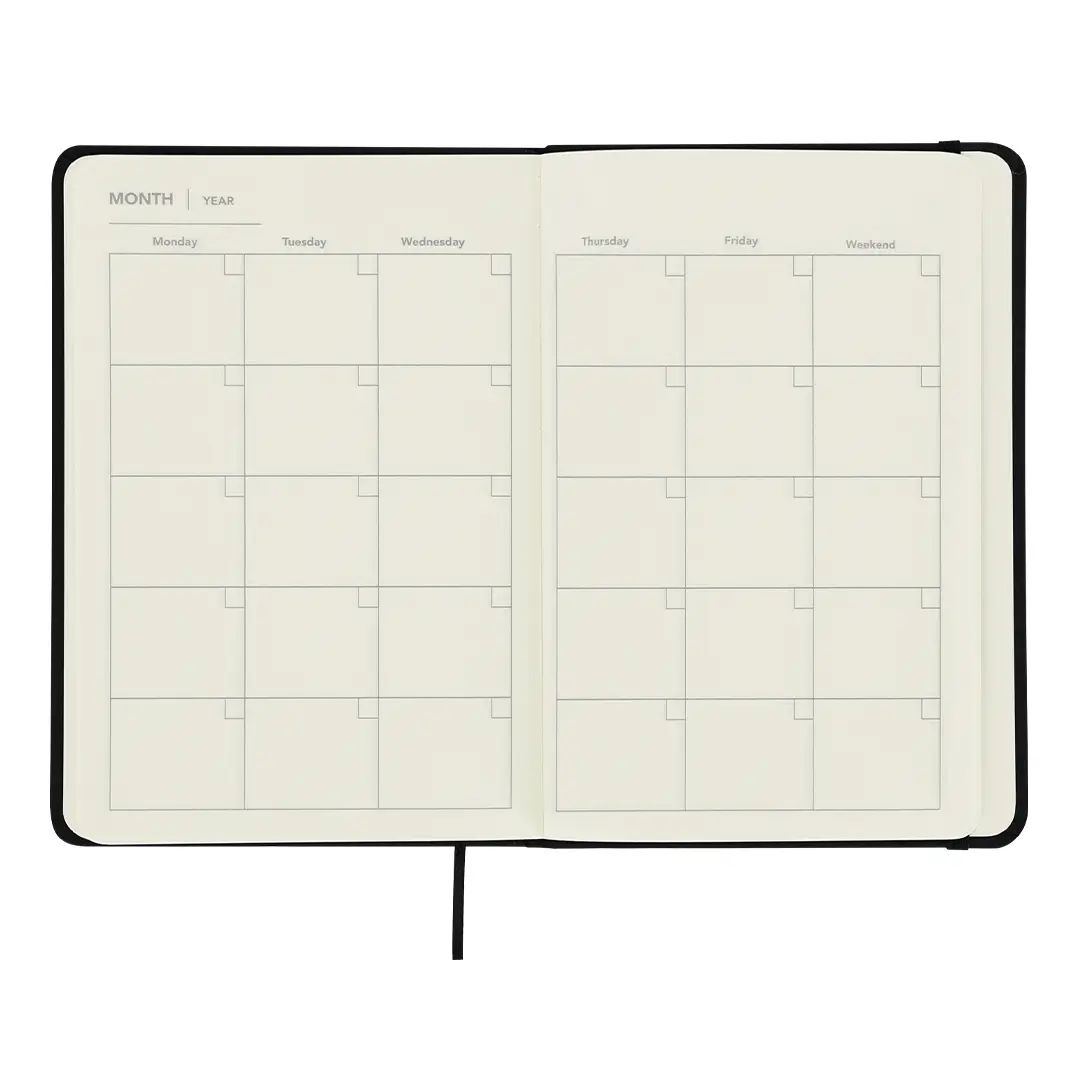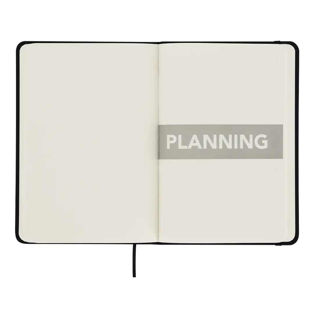 Bloc de notas con planificador mensual incluido. Elaborado en suave PU, con banda elástica a tono. Incluye: – 98 hojas color crema, sin líneas – 13 hojas de planificador mensual no fechado, con vista de calendario mensual – hojas adicionales para notas, con disposición a rayas Perfecto para planificar tu mes, tomar apuntes o notas y organizar tu día a día.