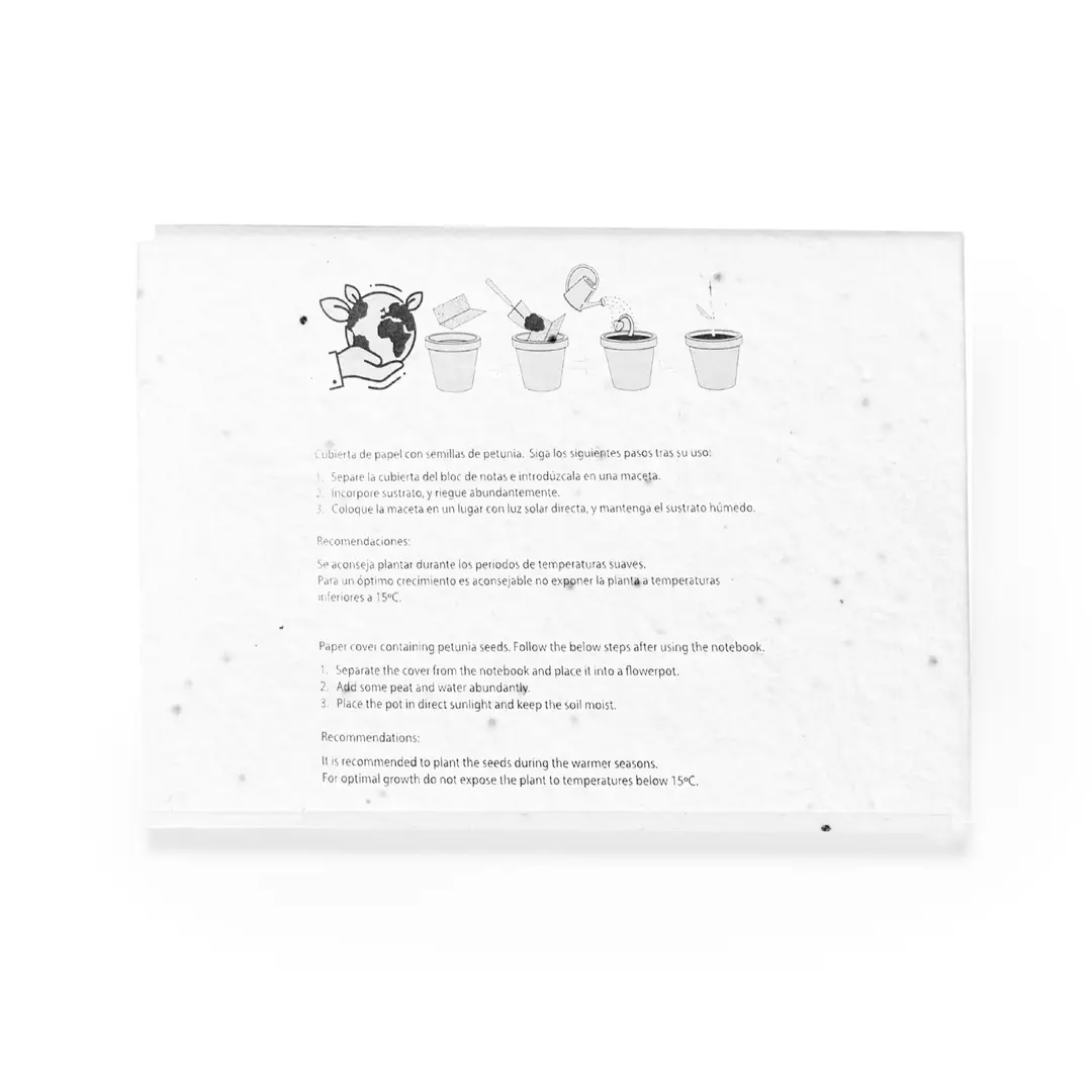 Bloc de notas con cubiertas fabricadas en papel semilla. En su interior, cuenta con 25 notas adhesivas medianas y 125 mininotas adhesivas en varios colores. La cubierta incluye semillas de petunia, convirtiéndolo en papel plantable al final de su vida útil. Incluye instrucciones de plantado en la cubierta trasera y se presenta en una bolsa individual de papel reciclado.