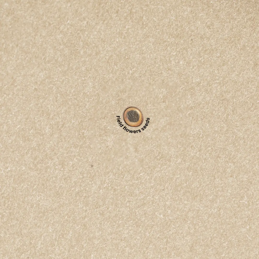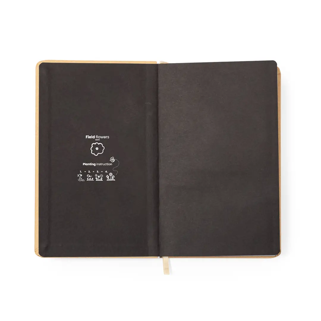Bloc de notas de semillas fabricado en resistente cartón reciclado. Con tapas rígidas, marcapáginas y 80 hojas interiores con disposición a una raya en papel reciclado. Además, en la portada contiene una cápsula con semillas de flores silvestres, en colores surtidos y con instrucciones de plantado en la cubierta trasera.El cartón reciclado proviene del reaprovechamiento de excedente de fabricaciones y reciclaje de papel en el final de su vida útil, convirtiéndose en un lienzo ecológico y sostenible.