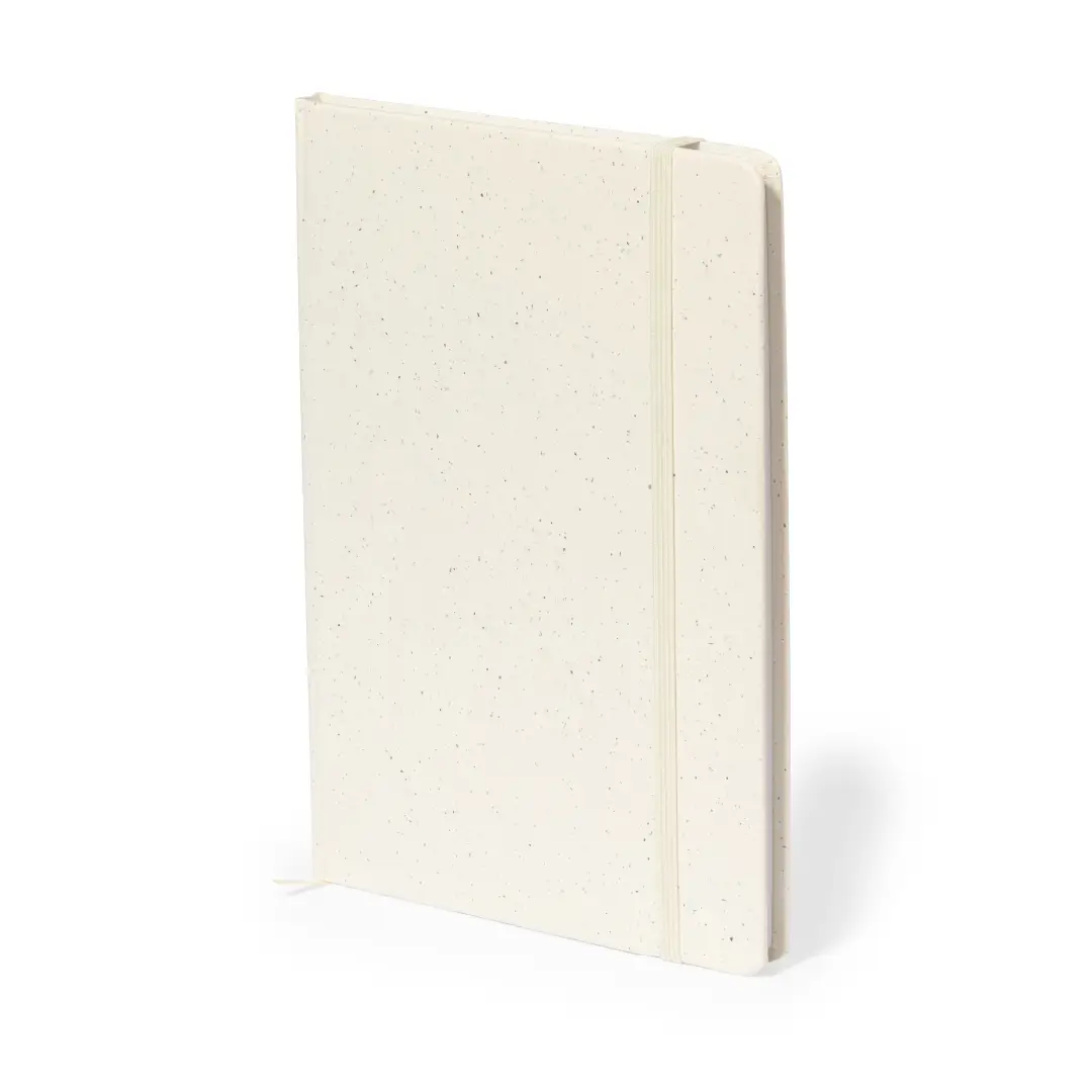 Bloc de notas A5 con tapas duras en resistente cartón reciclado. De 100 hojas blancas lisas y banda elástica para su cierre. Presentado en bolsa individual reciclada.