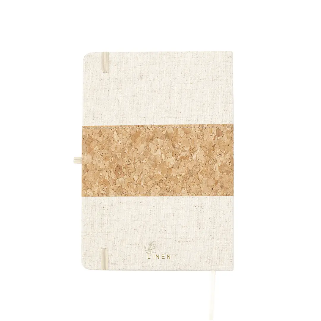 Bloc de notas de tapas exteriores confeccionadas en corcho y lino. De tapas rígidas, con soporte para bolígrafo, marcapáginas y 80 hojas lisas color natural. Presentado en bolsa individual. Elaborado con elementos vegetales para así fomentar la utilización de materias primas naturales y reducir las emisiones contaminantes.