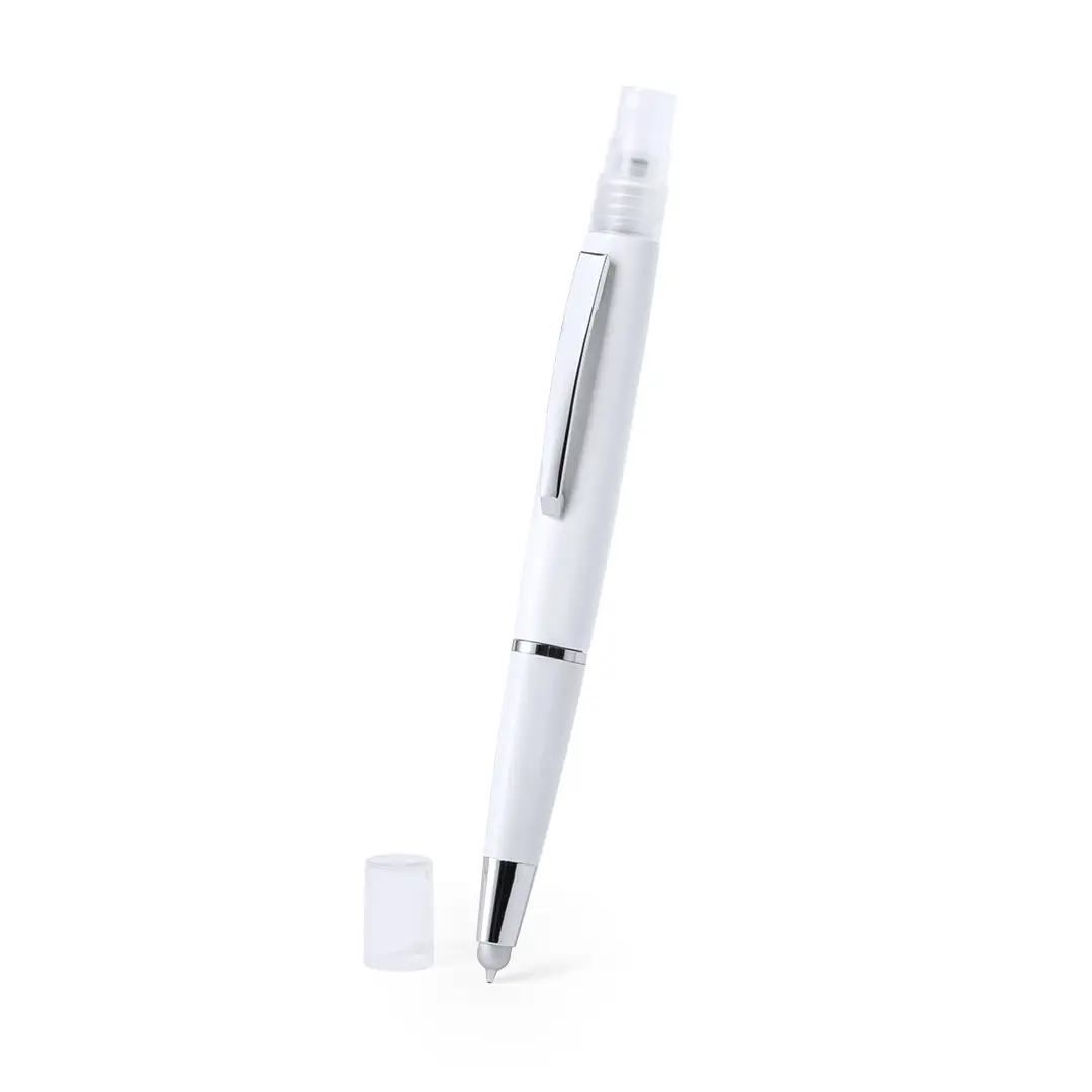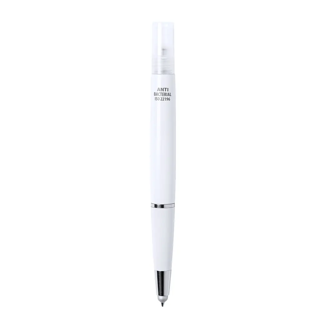 Bolígrafo antibacteriano con pulverizador recargable integrado y capucha protectora, incluye puntero en color gris. Acabado liso en resistente ABS brillante con elegante clip metálico y escritura en tinta azul. Capacidad del pulverizador 3ml. Líquido no incluido.Los productos con tratamientos antibacterianos son capaces de reducir drásticamente las cargas bacterianas presentes en las superficies de los materiales, gracias a la incorporación de agentes microbianos permanentes estáticos, con alta efectividad para inhibir y prevenir la contaminación bacteriana.Artículo de acuerdo al estándar ISO 22196, que determina la actividad antibacteriana en materiales plásticos y superficies no porosas, lo que permite conocer la efectividad de inhibición microbiana que tienen los aditivos sobre los objetos tratados mediante una evaluación cuantitativa.