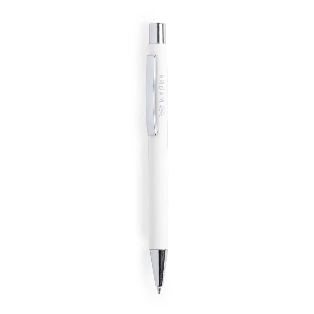 Original bolígrafo de mecanismo pulsador en elegante diseño bicolor. Con cuerpo de aluminio en tacto goma de acabado mate. Especialmente diseñado para marcaje en láser y mostrar el logotipo en tono plateado. Clip, parte superior y punta en plateado. Disponible en variada gama de colores, con cartucho jumbo y tinta azul.