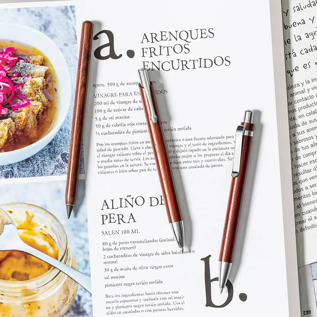 Bolígrafo de línea nature, con cuerpo fabricado madera natural. De mecanismo pulsador y accesorios en cromado, con amplio clip metálico para grabado en láser. De cartucho jumbo y en tinta azul.
