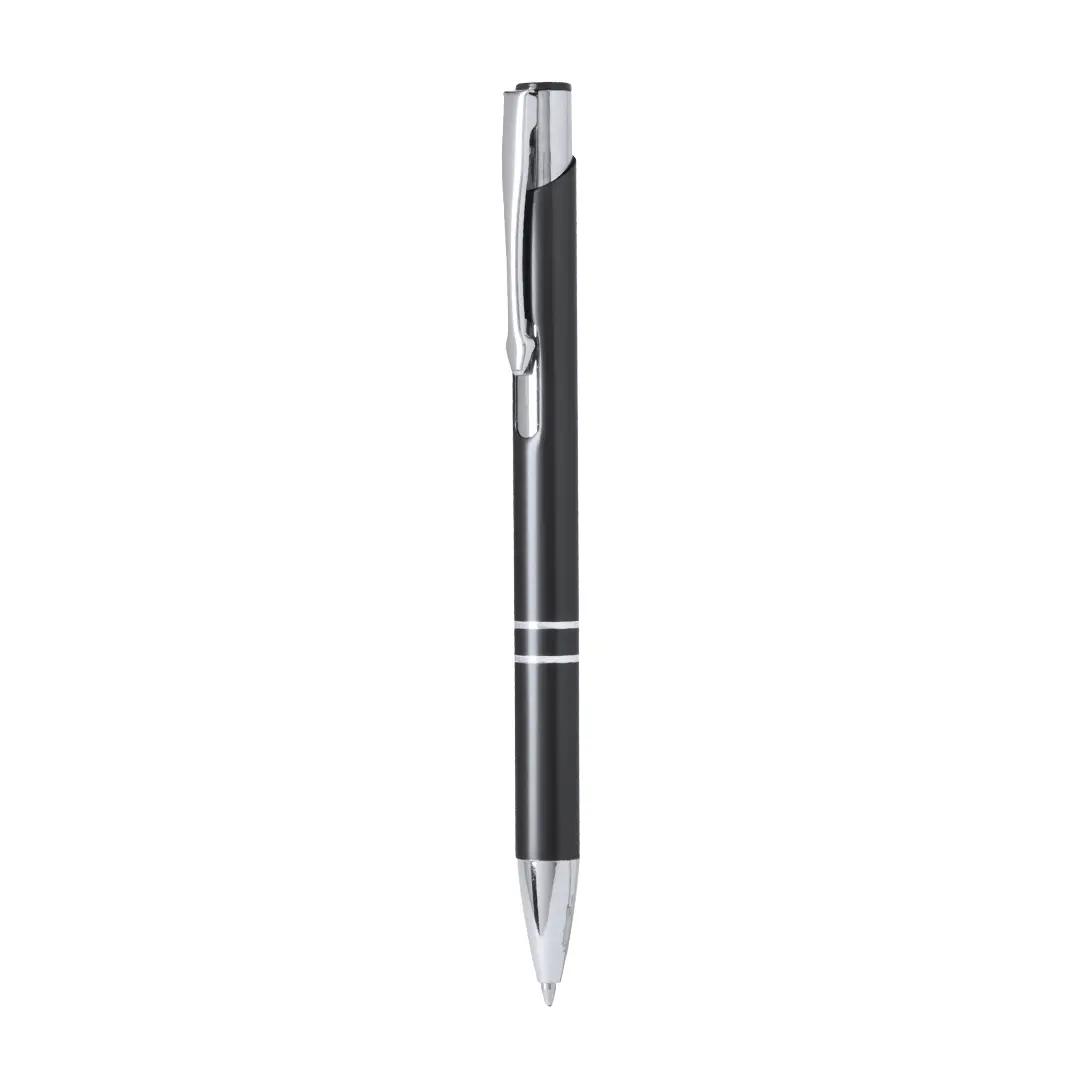 Bolígrafo de mecanismo pulsador fabricado en aluminio. Incluye accesorios plateados y clip, pulsador y punta a juego.En tinta negra.