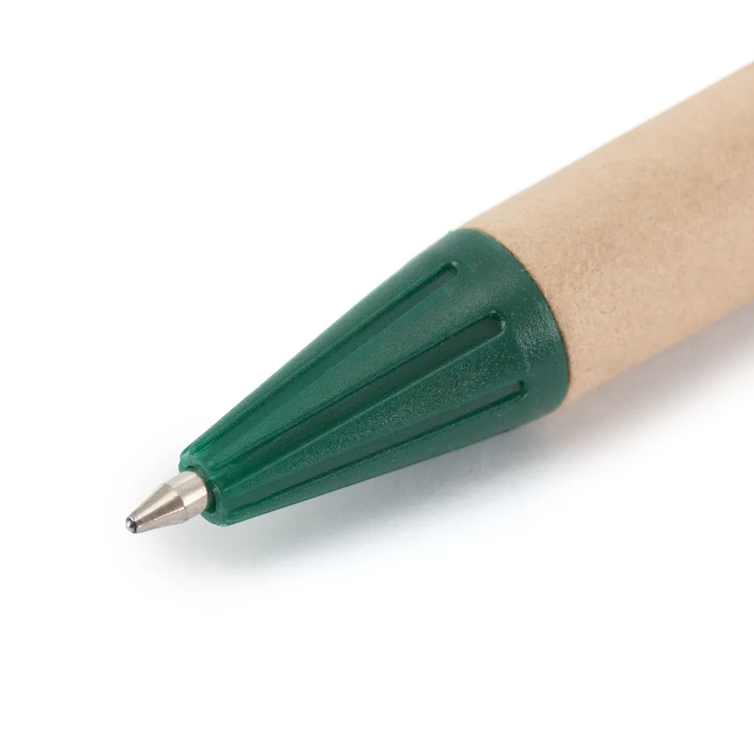 Bolígrafo de mecanismo pulsador en original combinación de cuerpo en cartón reciclado de color natural y accesorios en vivos colores. Tinta negra.
