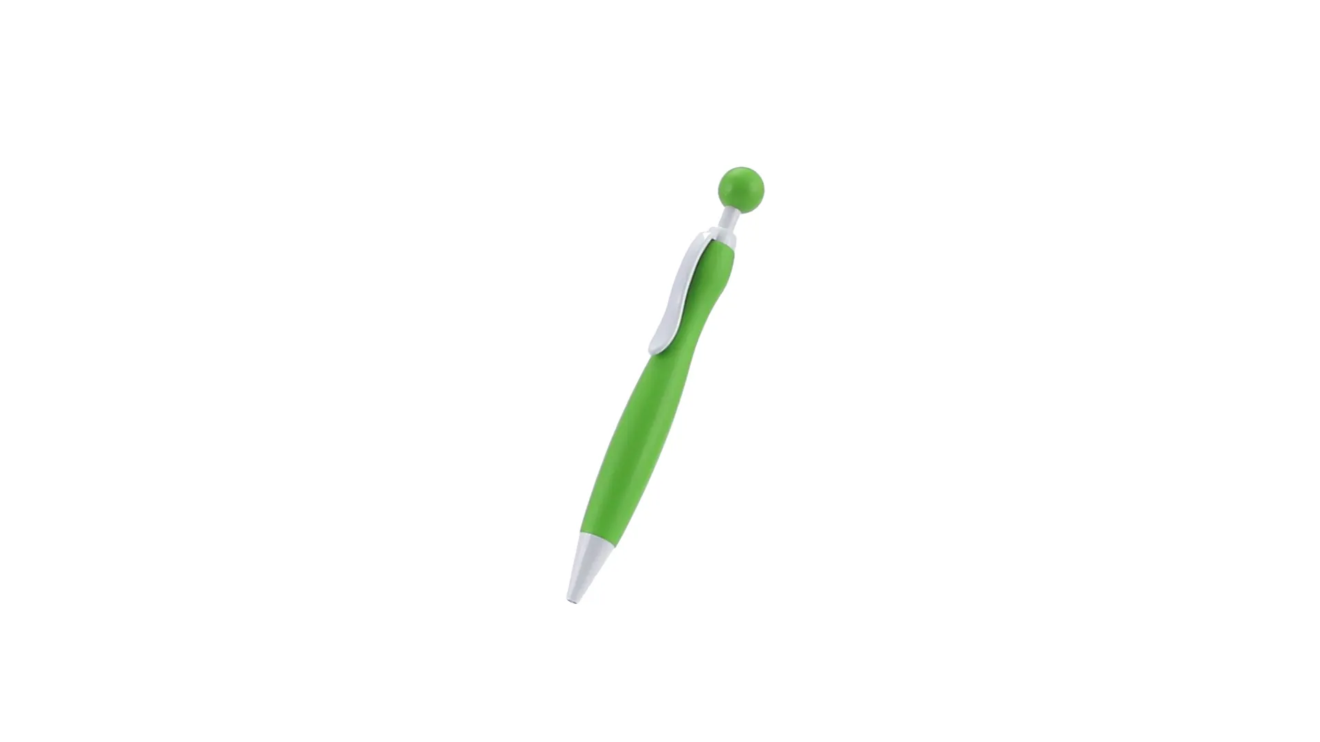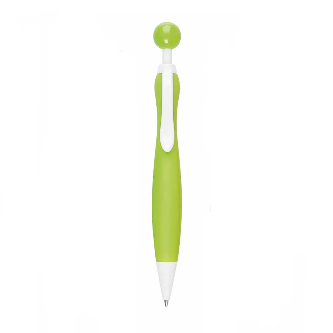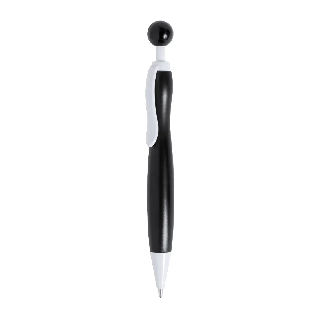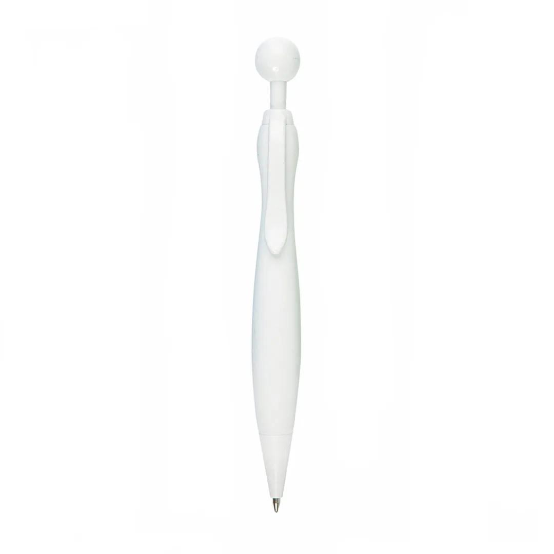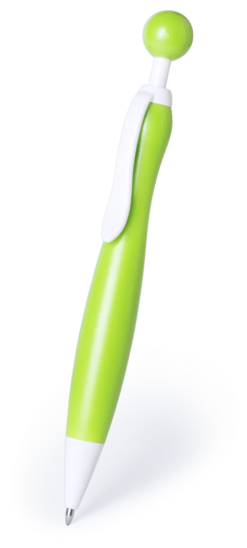 Bolígrafo de mecanismo pulsador de atrevido diseño bicolor con accesorios en color blanco sólido y cuerpo curvado de suave acabado en llamativos colores sólidos. Con original clip pulsador en forma de bola a juego. De cartucho jumbo y tinta azul.