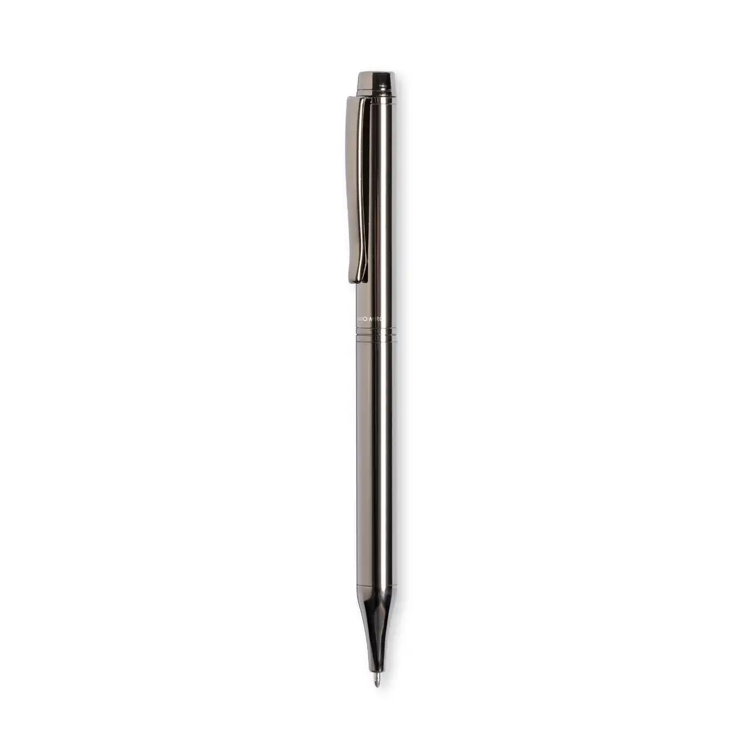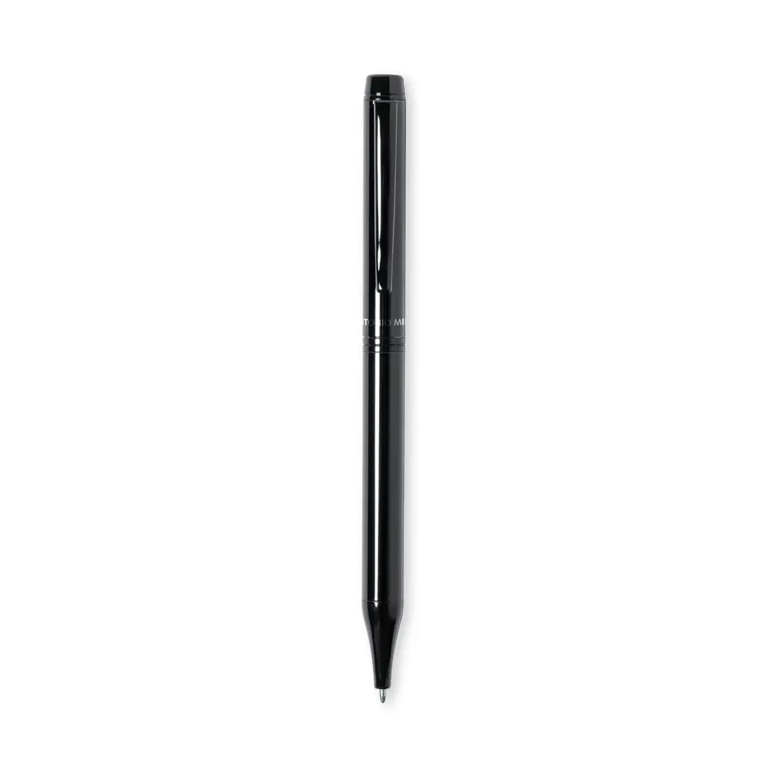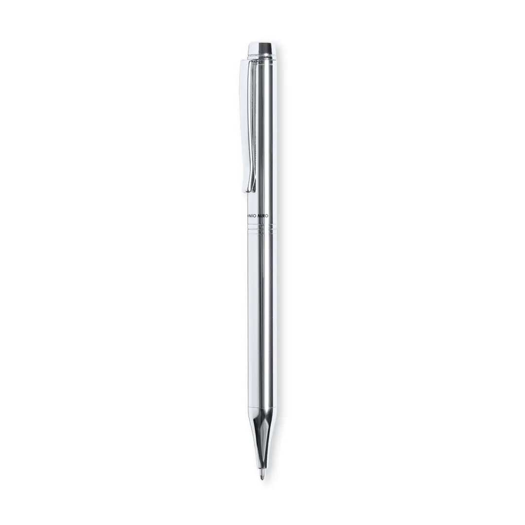 Bolígrafo de Antonio Miró fabricado en metal de acabado brillante, con logotipo de la marca en cuerpo y disponible en variada gama de colores. Con mecanismo giratorio y en tinta azul. Presentado en elegante y resistente caja individual negra con logotipo Antonio Miró y funda a juego.