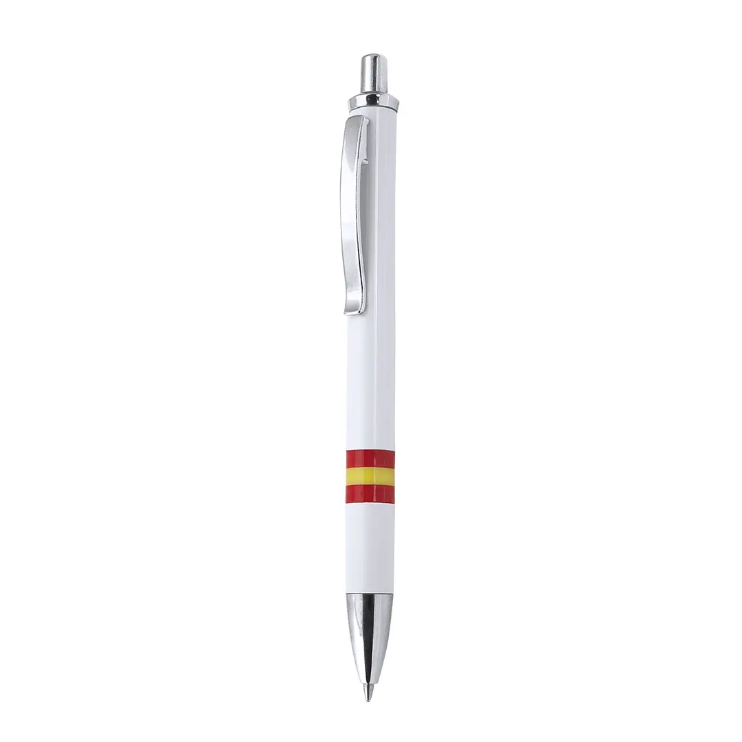 Bolígrafo de mecanismo pulsador de elegante diseño bicolor con accesorios en color plateado brillante y cuerpo de suave acabado en color blanco brillante con la bandera nacional. Con clip metálico, de cartucho jumbo y tinta azul.