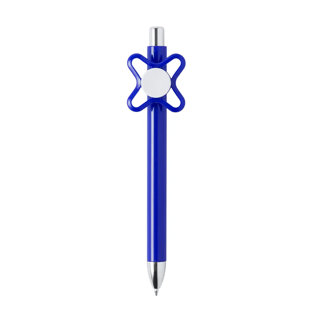 Original bolígrafo spinner antiestrés de mecanismo pulsador y divertido diseño con accesorios en color plateado y cuerpo de acabado sólido en colores brillantes. Especialmente diseñado para tampografía en clip y en cuerpo. De cartucho jumbo y en tinta azul.
