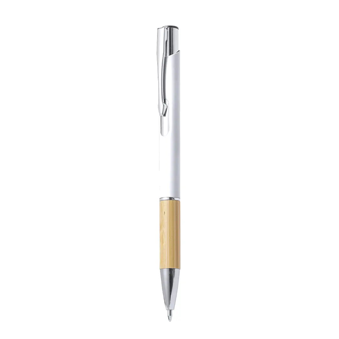 Elegante bolígrafo de línea nature y mecanismo pulsador. Cuerpo en resistente aluminio de acabado goma y empuñadura en bambú, con la caña en una amplia gama de distintivos colores. Clip metálico, con mecanismo pulsador y en tinta azul. Presentado en bolsa individual reciclada.