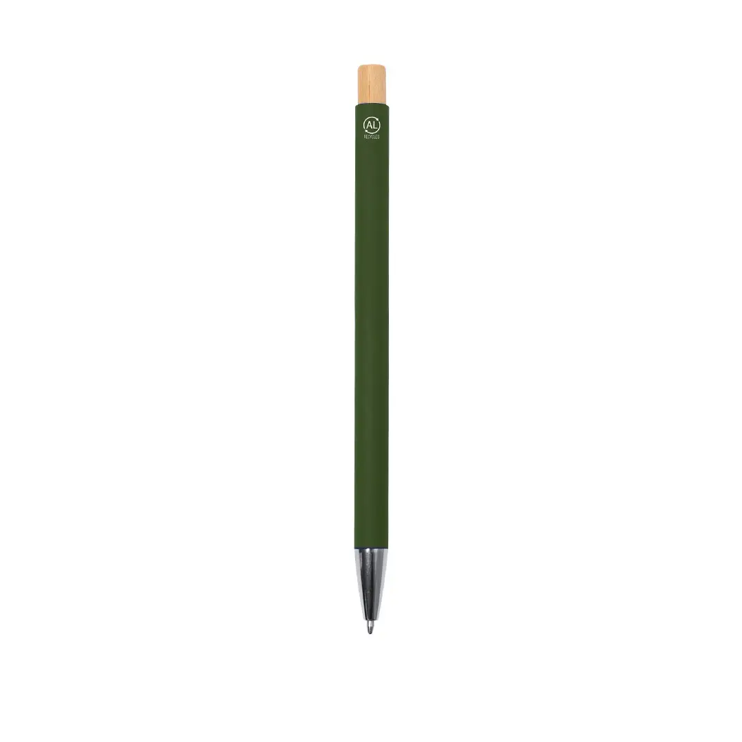 Bolígrafo de mecanismo pulsador fabricado en aluminio reciclado. Pulsador en bambú y cuerpo acabado goma mate. Clip metálico y distintivo aluminio reciclado en la parte superior del bolígrafo, en tinta azul.El aluminio reciclado es un material con posibilidades de reciclaje casi infinitas, sin perder sus propiedades originales y consumiendo menos energía en este proceso.Certificación GRS (Global Recycled Standard / Estándar de Reciclaje Global), que garantiza el origen reciclado del material usado para fabricar el producto.Materiales como el Bambú fomentan la utilización de materias primas naturales reduciendo las emisiones contaminantes. Además, el bambú proviene de una planta de gran resistencia y versatilidad, con crecimiento y regeneración rápida, siendo una excelente alternativa al uso de madera tradicional.Carga Jumbo