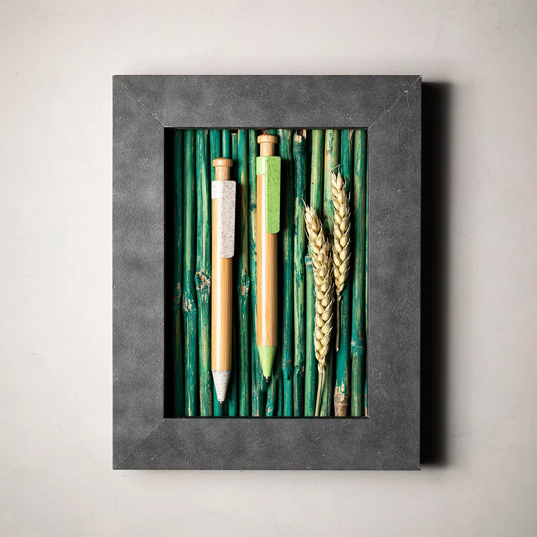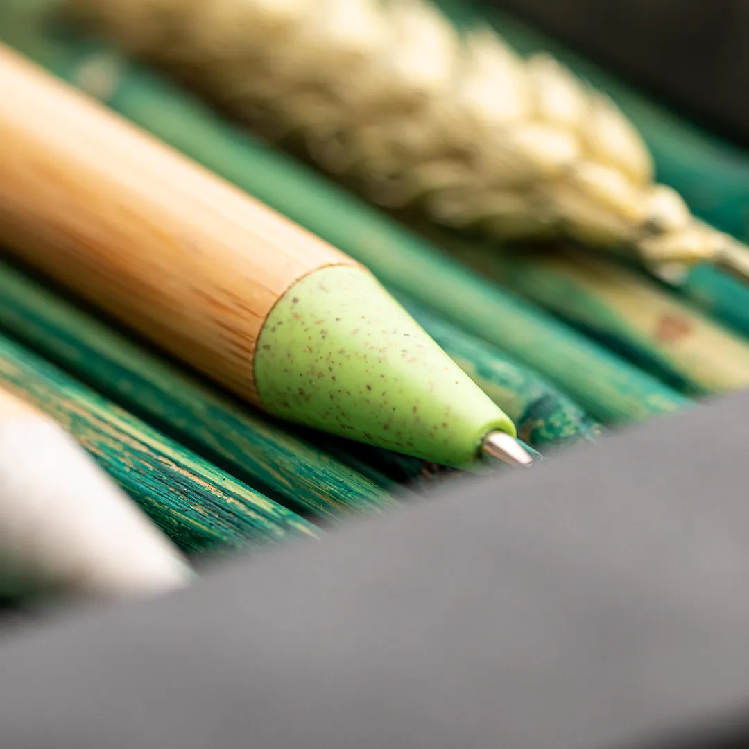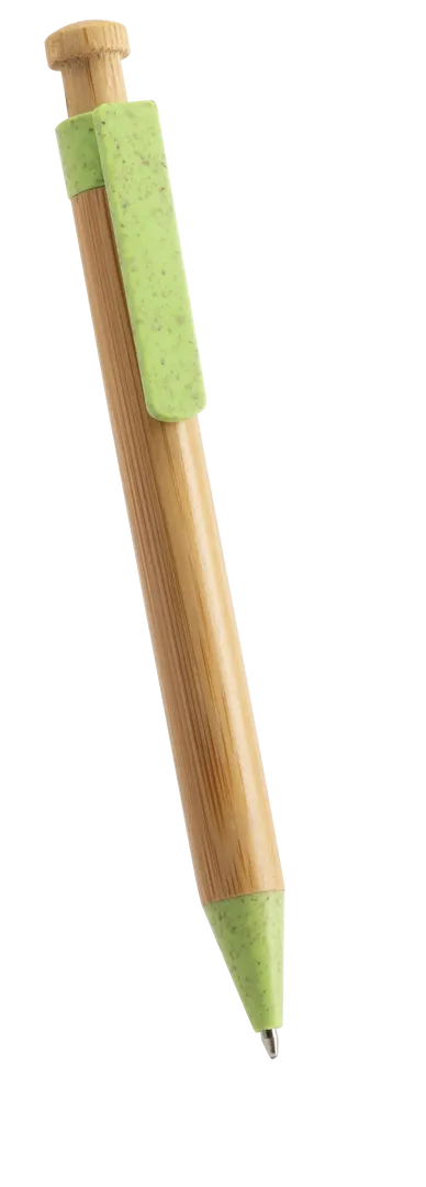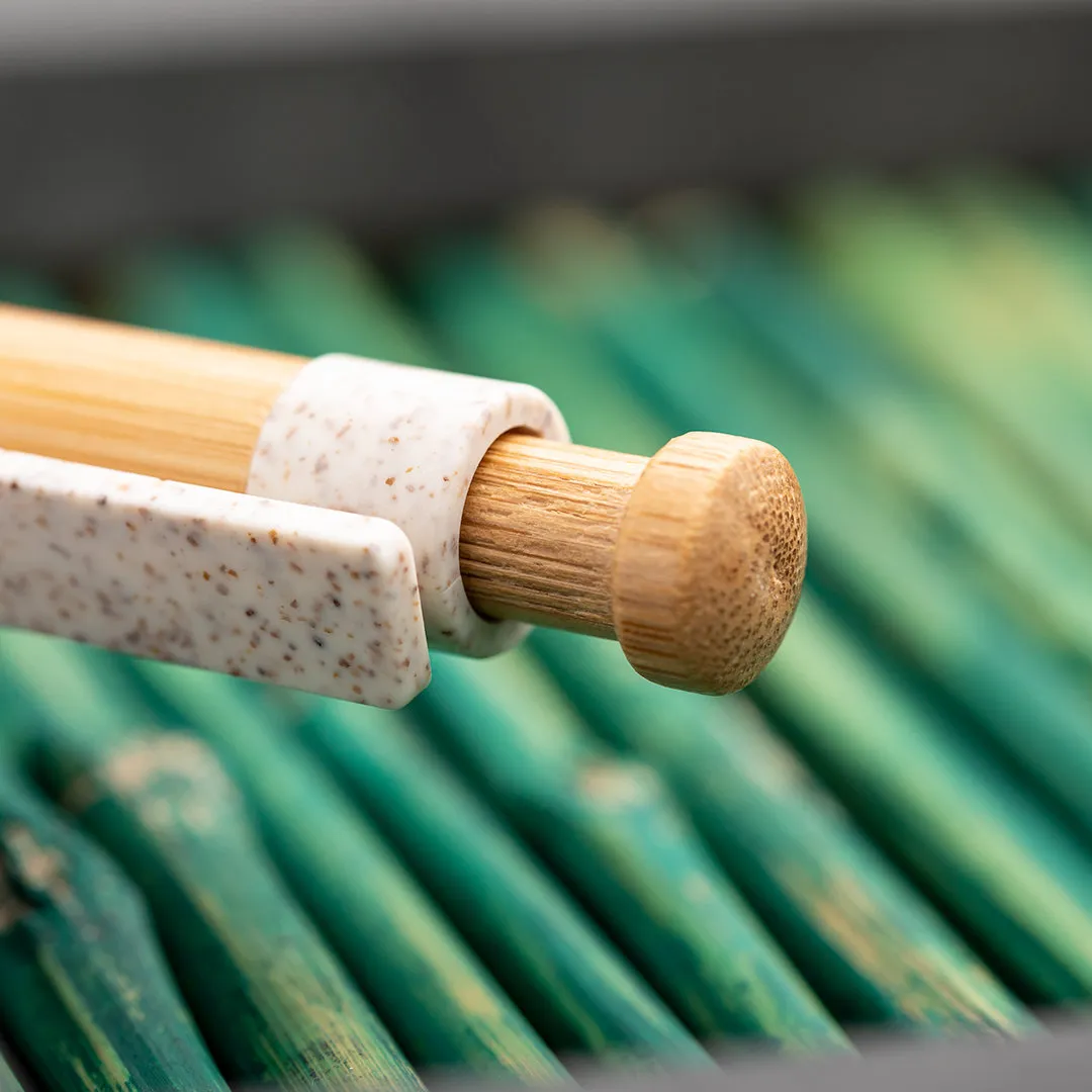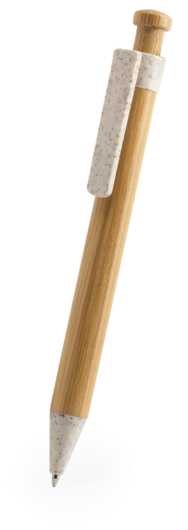 Bolígrafo de línea nature con cuerpo y pulsador biselado en madera de bambú. Clip y punta en caña de trigo, para así fomentar la utilización de materias primas naturales y reducir las emisiones contaminantes. De mecanismo pulsador y con tinta azul. Disponible en colores nature.
