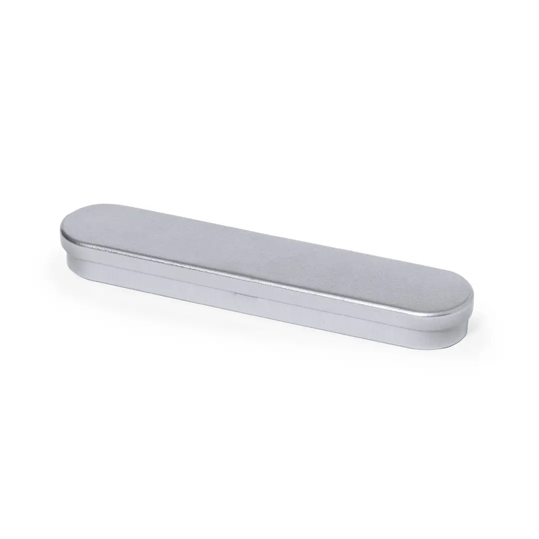 Bolígrafo láser metálico en elegante acabado brillo, con pulsadores de activación laterales para funciones láser y linterna (pilas de botón incluidas). En tinta azul, con puntero táctil integrado, cierre de capucha y clip cromado. Especialmente diseñado para marcaje en láser. Presentado en un elegante estuche metálico en caja individual de cartón de acabado plateado. Interior en suave esponja troquelada, con pilas de recambio.