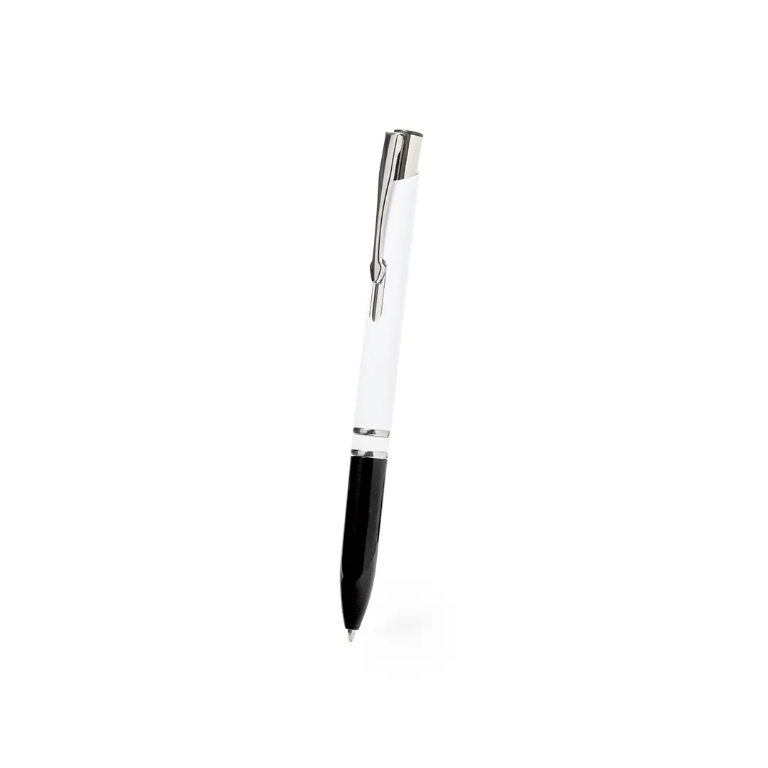 Elegante bolígrafo con mecanismo pulsador. Con cuerpo acabado en color blanco brillo y empuñadura en variada gama colores. Fabricado en resistente ABS acabado brillo. Con carga jumbo y tinta azul.