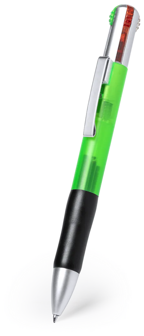 Bolígrafo 4 en 1 de mecanismo pulsador retráctil, de clásico diseño y cuerpo de suave acabado translúcido en vivos colores. Con accesorios en plateado y suave empuñadura ergonómica en color negro. De 4 cartuchos en tintas azul, roja, negra y verde.