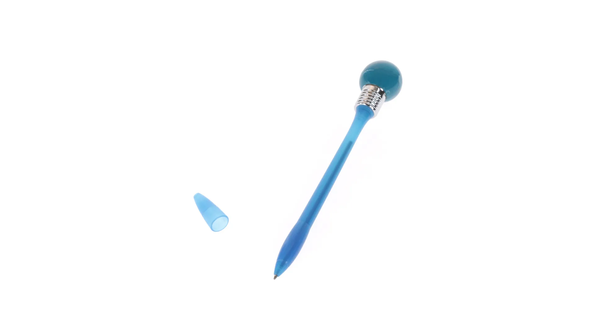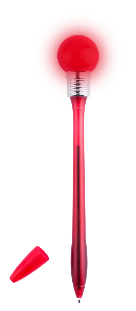 Divertido bolígrafo bombilla con cuerpo de suave acabado en vivos colores transparentes. Con linterna esférica de goma con luz a juego que se activa dejando caer el bolígrafo en una superficie dura. Capucha a juego y en tinta azul.