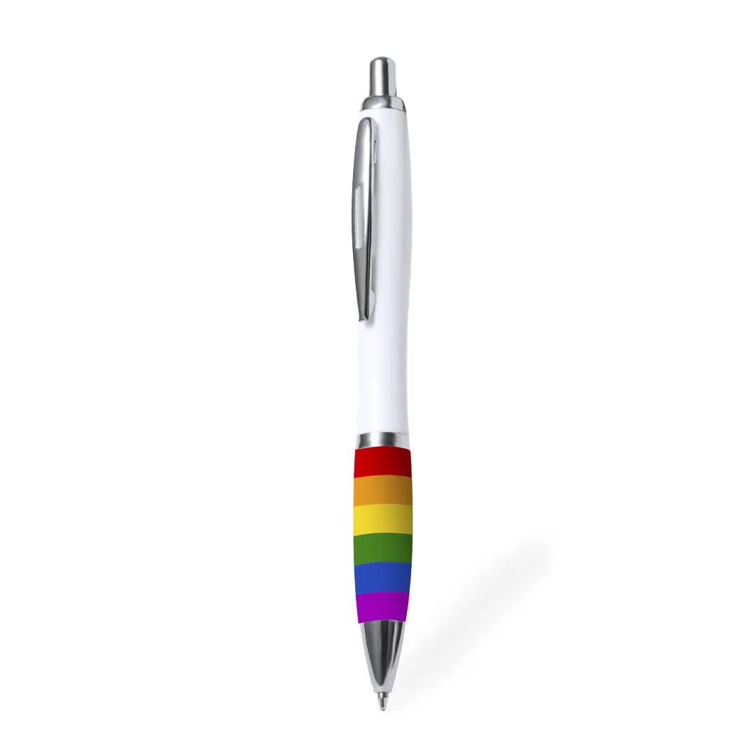 Bolígrafo Rainbow, con empuñadura multicolor y cuerpo en acabado blanco. De mecanismo pulsador, con clip metálico y accesorios cromados. Todo un orgullo de bolígrafo, en tinta azul.