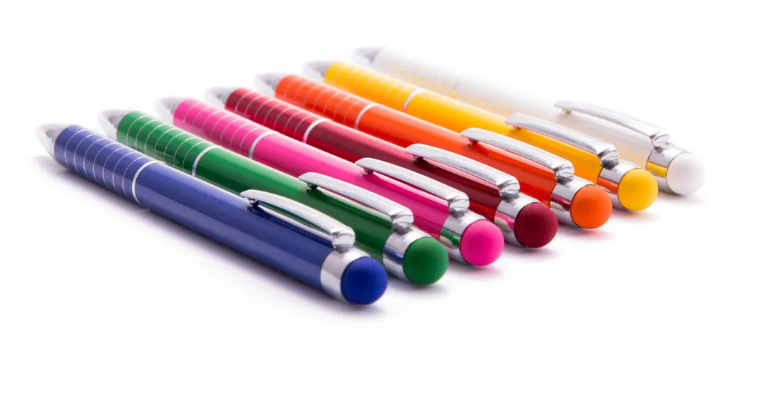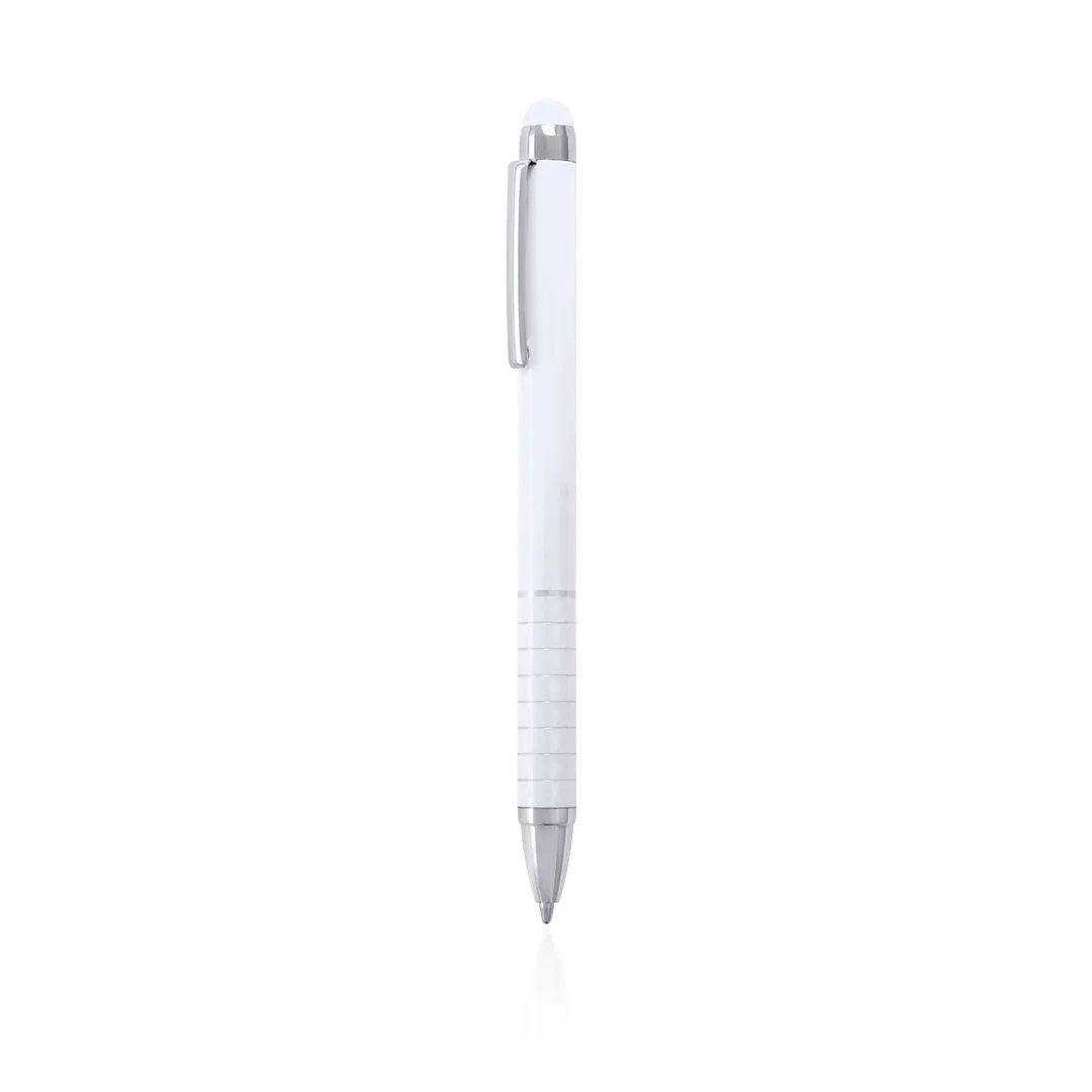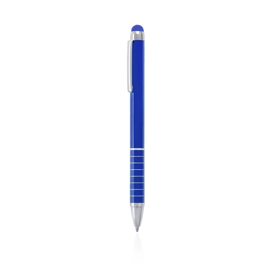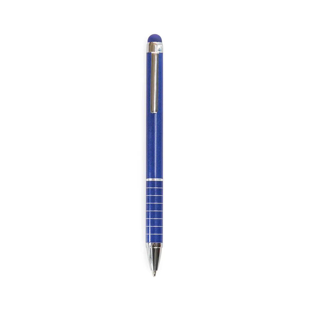 Bolígrafo puntero de mecanismo giratorio con cuerpo en aluminio de suave acabado metalizado en vivos colores. Accesorios y anillas en color plateado. Original empuñadura anillada, puntero a juego y tinta azul.