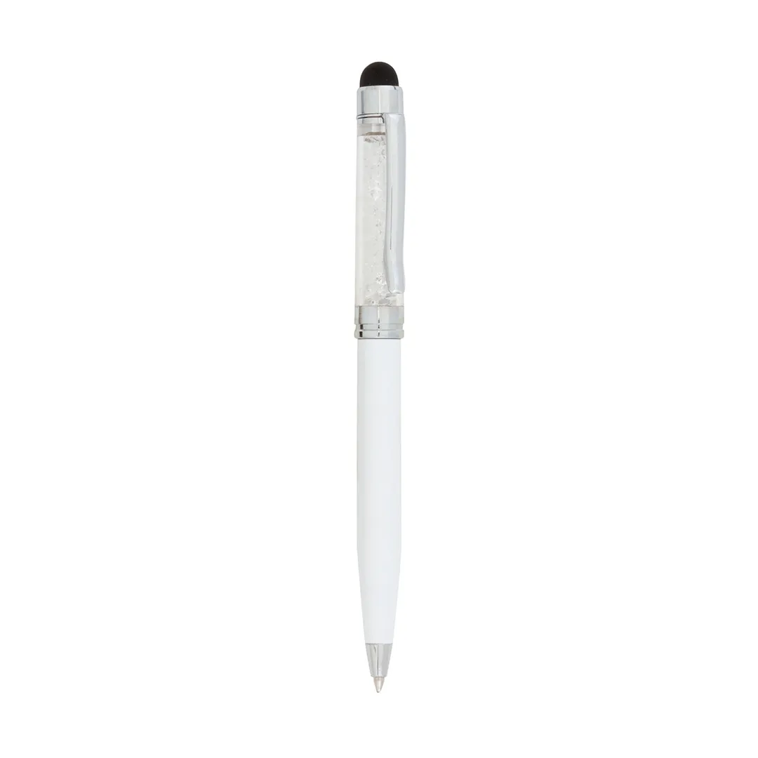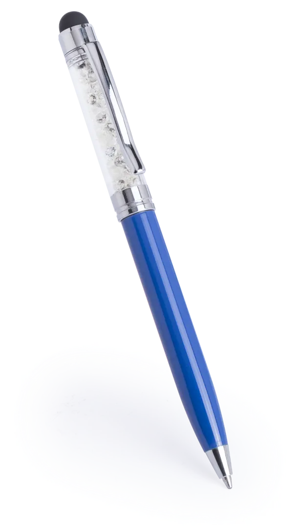 Original bolígrafo puntero de mecanismo giratorio con divertido líquido burbujeante en parte superior. Cuerpo metálico en suave acabado de vivos colores y accesorios en color plateado brillante. En tinta azul.