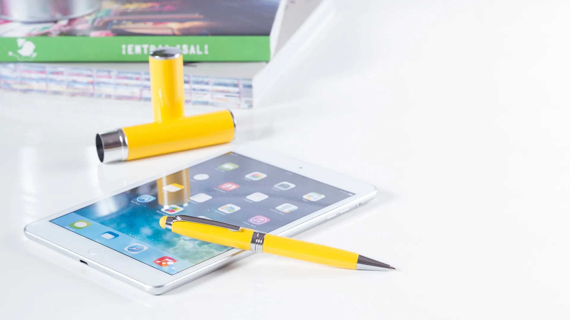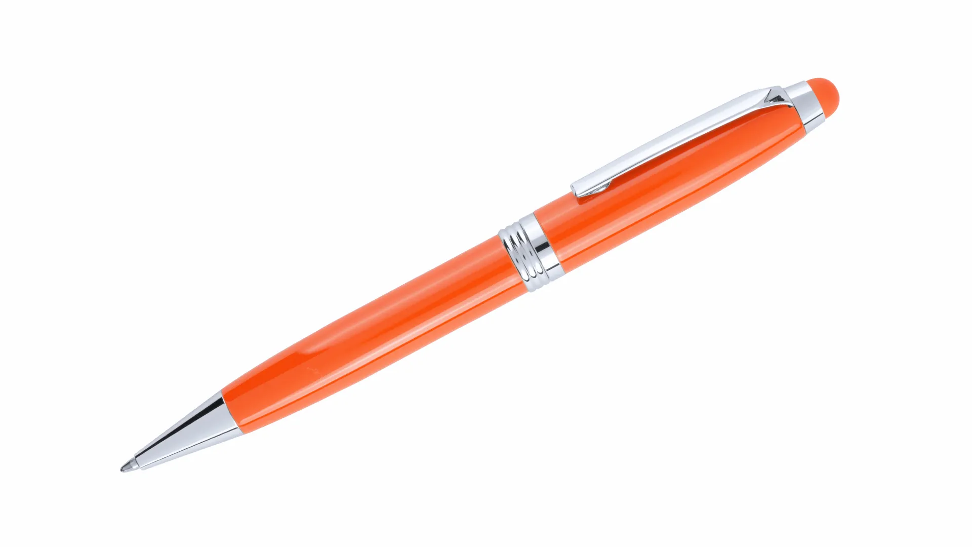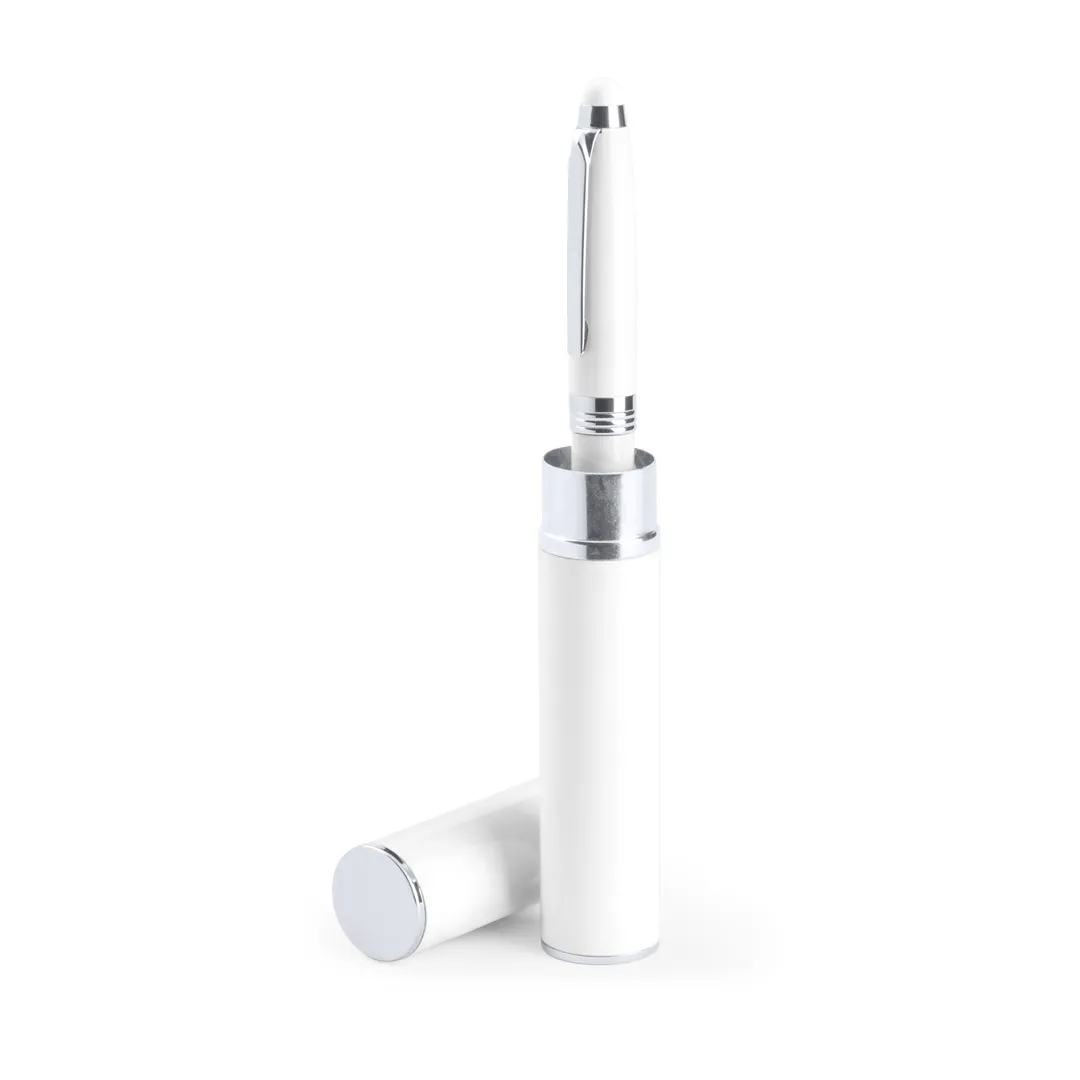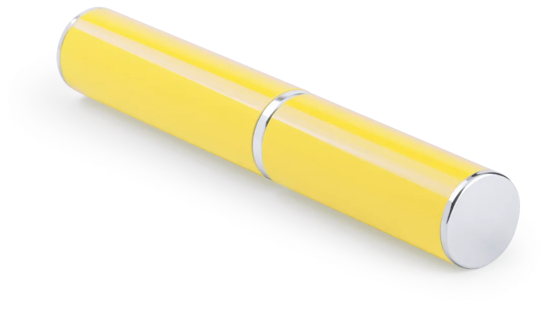 Bolígrafo puntero de mecanismo giratorio con cuerpo metálico de suave acabado en alegres colores. Accesorios y anillas en color plateado. Con puntero a juego y presentado en original estuche metálico a juego. De cartucho jumbo y tinta azul.