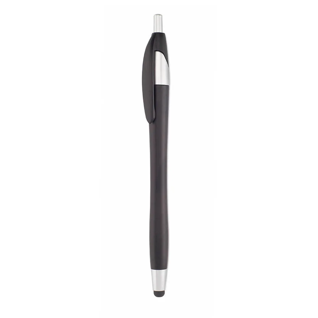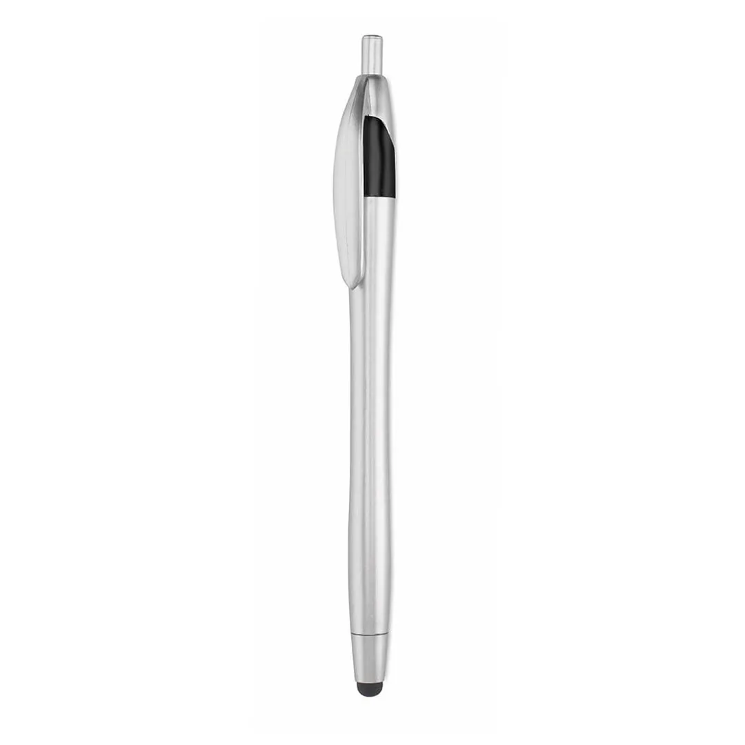 Bolígrafo puntero de mecanismo pulsador, con cuerpo y accesorios en acabado metalizado. Disponible en variada combinación de colores. Tinta azul.