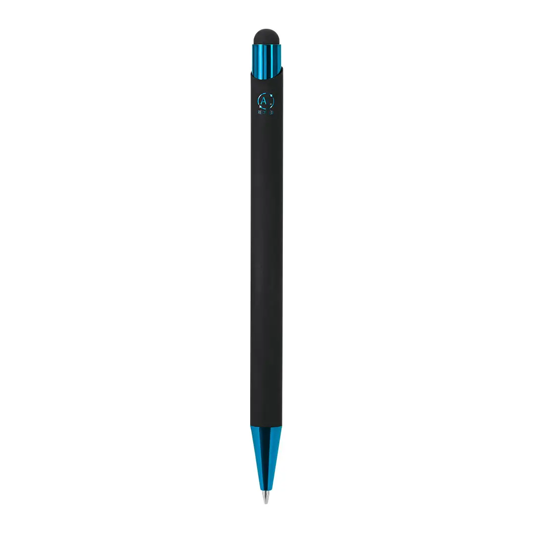 Bolígrafo puntero de mecanismo pulsador fabricado en aluminio reciclado. Pulsador, clip metálico y punta en acabado brillante. Cuerpo terminación en goma, especialmente diseñado para marcaje en láser con efecto espejo. Distintivo aluminio reciclado en la parte superior del bolígrafo. De carga jumbo y en tinta azul.