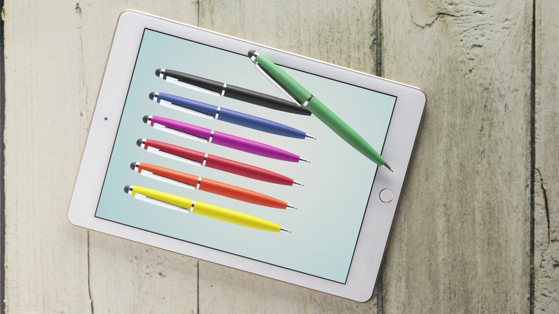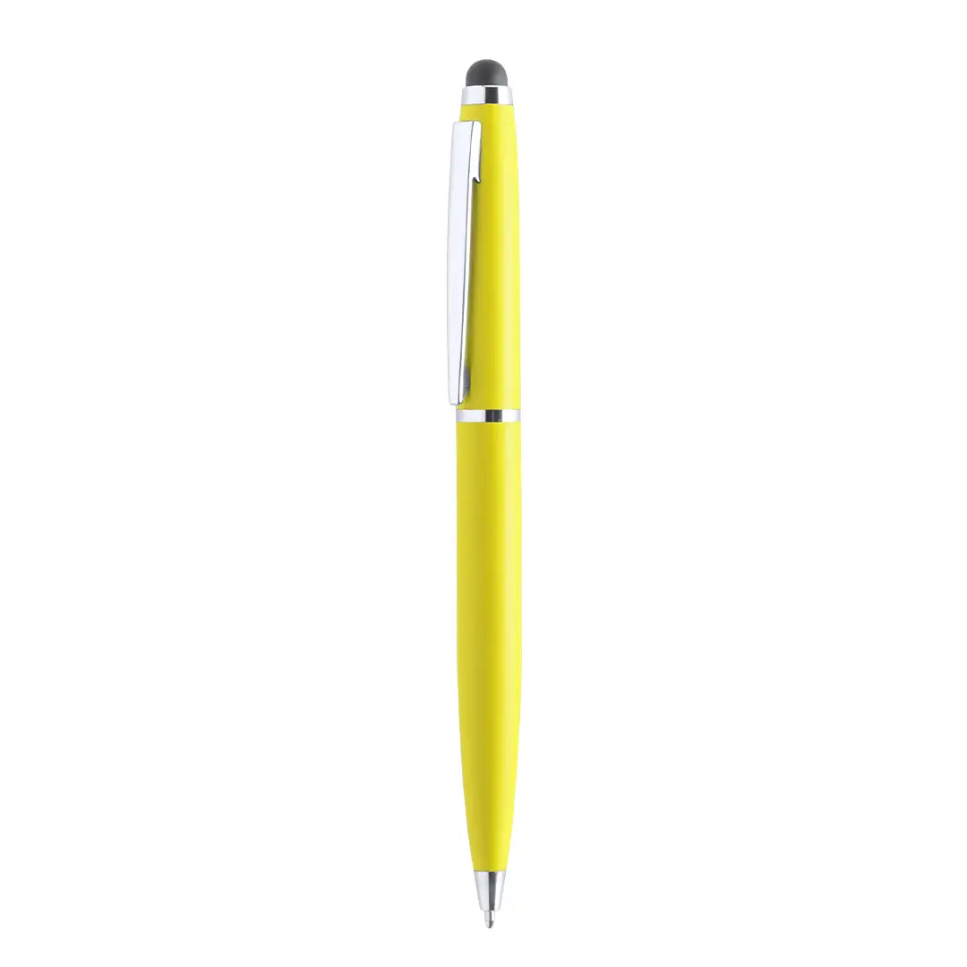 Bolígrafo puntero de mecanismo giratorio con cuerpo metálico de suave acabado en alegres colores. Accesorios y anillas en color plateado. Tinta azul.