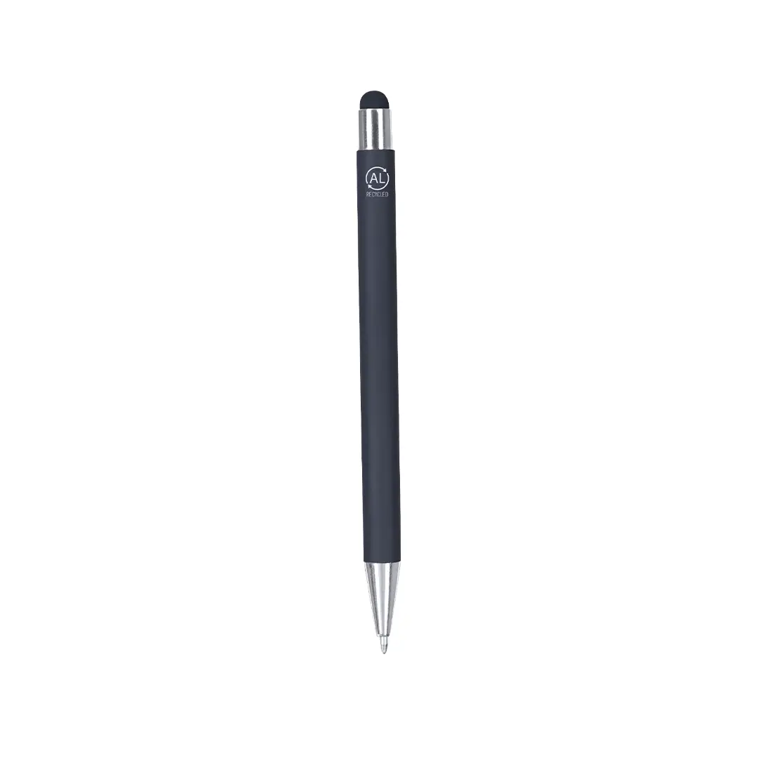 Bolígrafo puntero de mecanismo pulsador fabricado en aluminio reciclado. Pulsador y clip metálico en acabado cromado, acabado en puntero a juego. Cuerpo terminación en goma, especialmente diseñado para marcaje en láser. Distintivo aluminio reciclado en la parte superior del bolígrafo. De cartucho jumbo y en tinta azul. El aluminio reciclado es un material con posibilidades de reciclaje casi infinitas, sin perder sus propiedades originales y consumiendo menos energía en este proceso.Certificación GRS (Global Recycled Standard / Estándar de Reciclaje Global), que garantiza el origen reciclado del material usado para fabricar el producto.