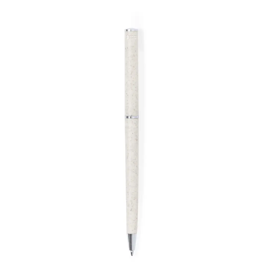 Bolígrafo con cuerpo en caña de trigo. Clip metálico y accesorios cromados. De mecanismo giratorio y de tinta azul. Con logotipo caña de trigo y disponible en color nature.La caña de trigo fomenta la utilización de materias primas naturales, reduciendo así las emisiones contaminantes.