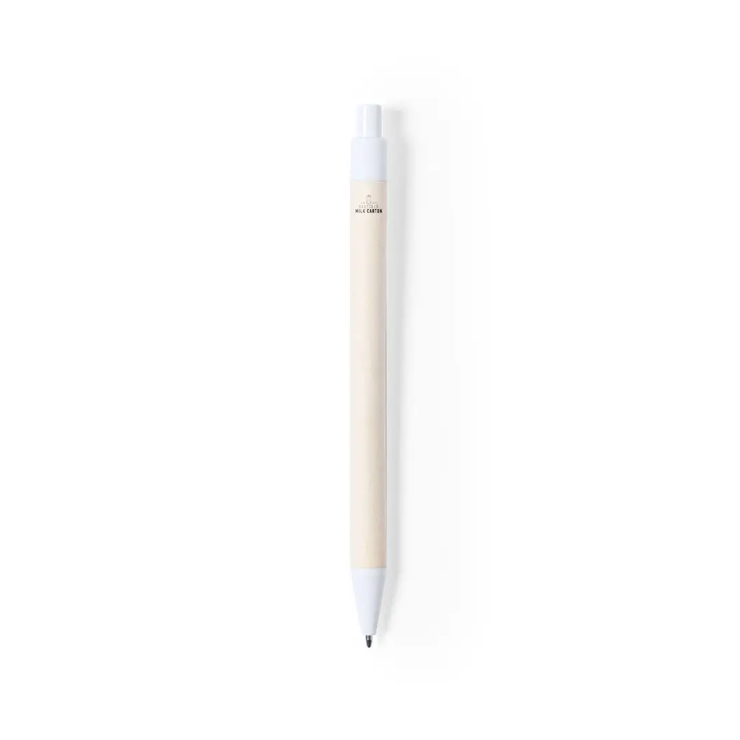 Bolígrafo de línea nature, con cuerpo fabricado con cartones de leche reciclados y detalles en color blanco. De mecanismo pulsador y en tinta azul, con distintivo cartón de leche reciclado en el cuerpo. Los cartones de leche se componen en su mayor parte de cartón y aluminio. Durante su proceso de reciclado, se separan los distintos materiales del envase para su reutilización y nuevo uso, contribuyendo así a recorrer el camino infinito de la economía circular. Este material se caracteriza por su alto grado de reciclabilidad, así como por su ligereza y resistencia.