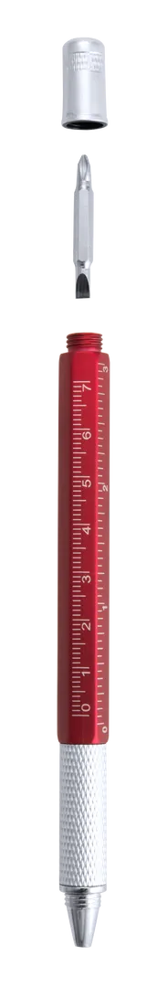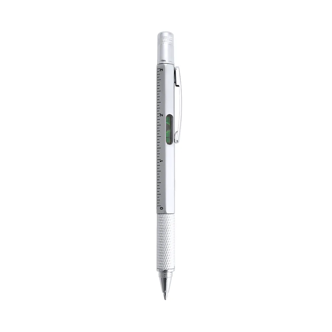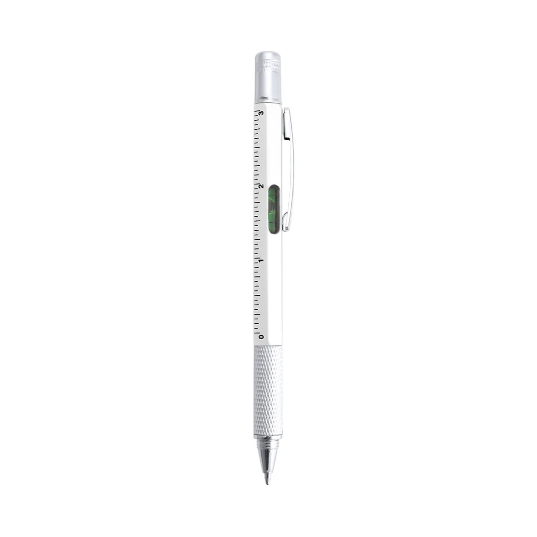 Bolígrafo multiherramienta 4 en 1 de mecanismo giratorio, en variados colores y con suave empuñadura. Con nivel integrado en cuerpo, regla con sistema métrico en centímetros/pulgadas y destornillador de doble cabeza -plana y de estrella-. Con clip metálico y tinta azul.