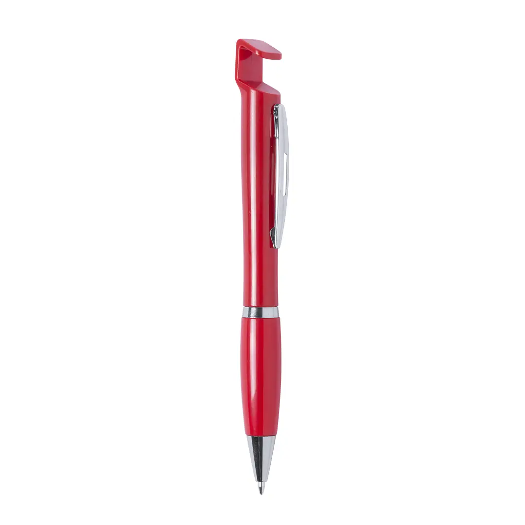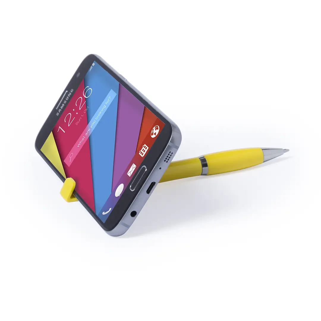 Bolígrafo con soporte para dispositivo móvil. De mecanismo pulsador y atrevido diseño bicolor con accesorios en color plateado y cuerpo de suave acabado en divertidos colores sólidos. Con original clip metálico troquelado a juego y cómoda empuñadura. Tinta azul.