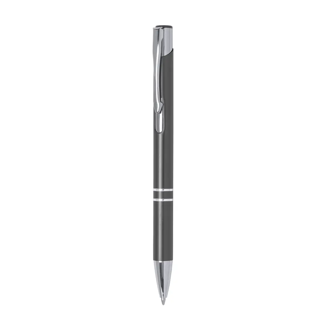 Original bolígrafo de mecanismo pulsador en elegante diseño bicolor. Con cuerpo troquelado en aluminio de suave acabado en variados colores. Original clip, anillas y punta en plateado. De cartucho jumbo y tinta azul.