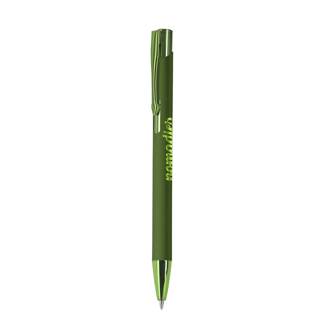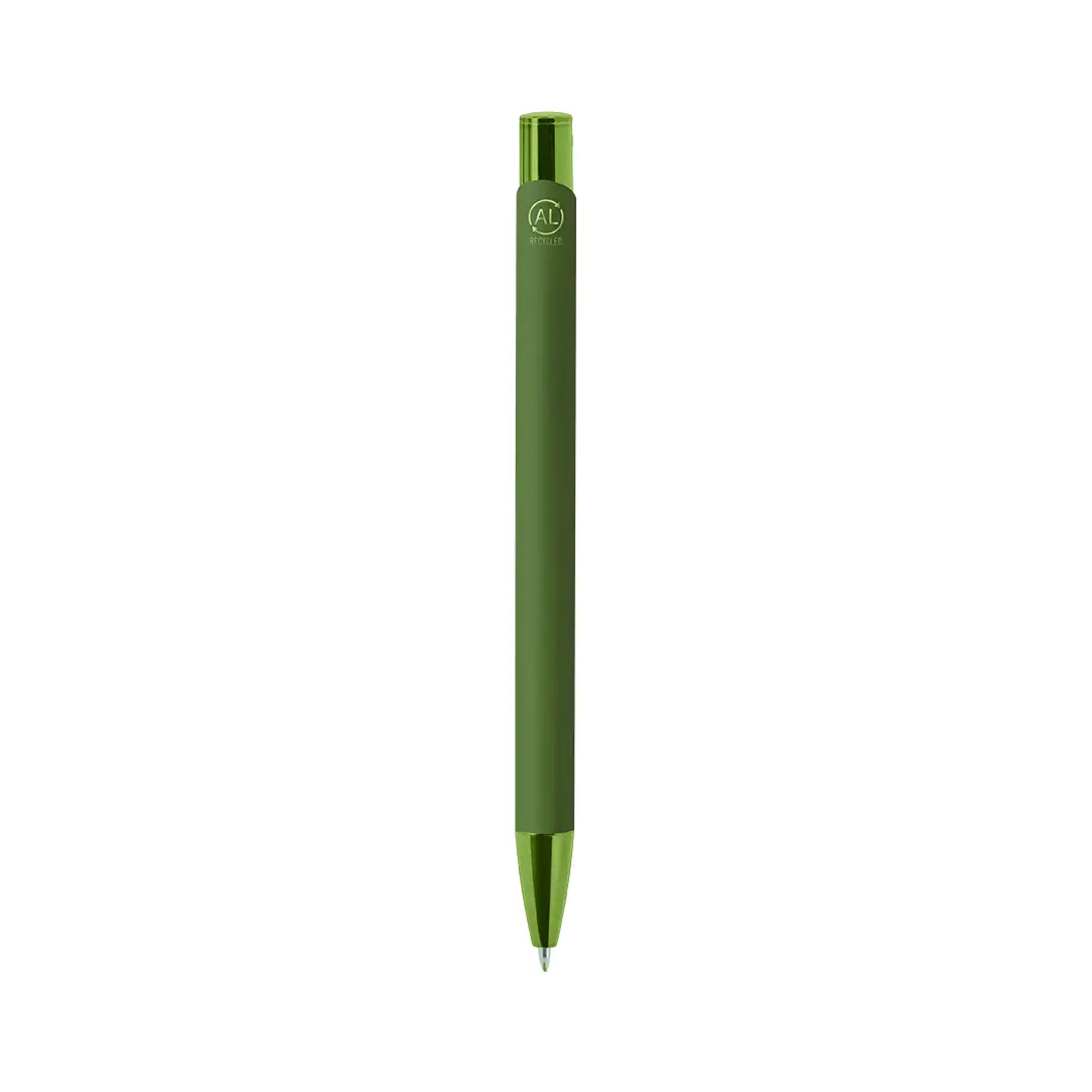 Bolígrafo de mecanismo pulsador. Acabado en aluminio reciclado gomoso, de cartucho jumbo y tinta azul. Diseño especial para grabado láser con resultado en efecto espejo.Con distintivo logo de Aluminio Reciclado.