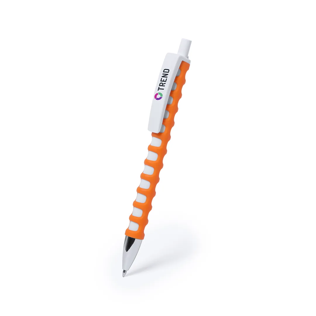 Bolígrafo de mecanismo pulsador de original diseño, con cuerpo troquelado de suave tacto goma en vivos colores. Con clip maxi en color blanco para marcaje y punta en color plateado brillante.
