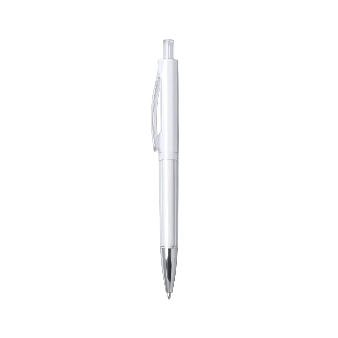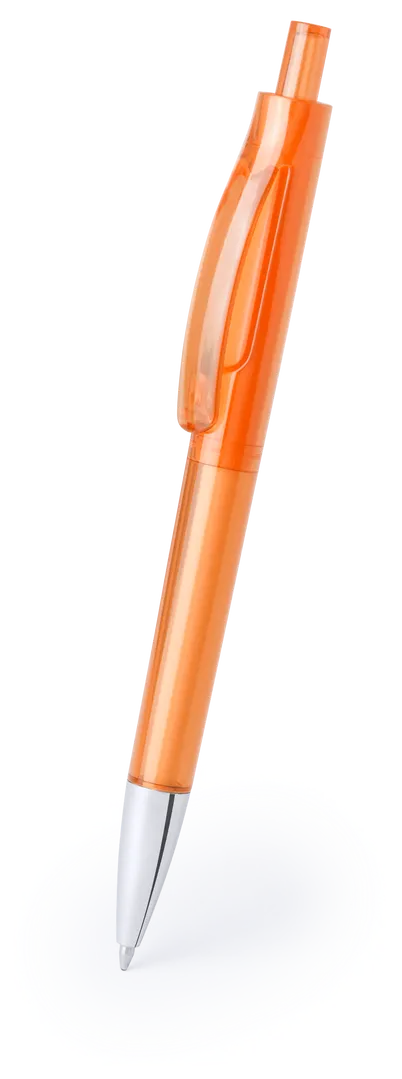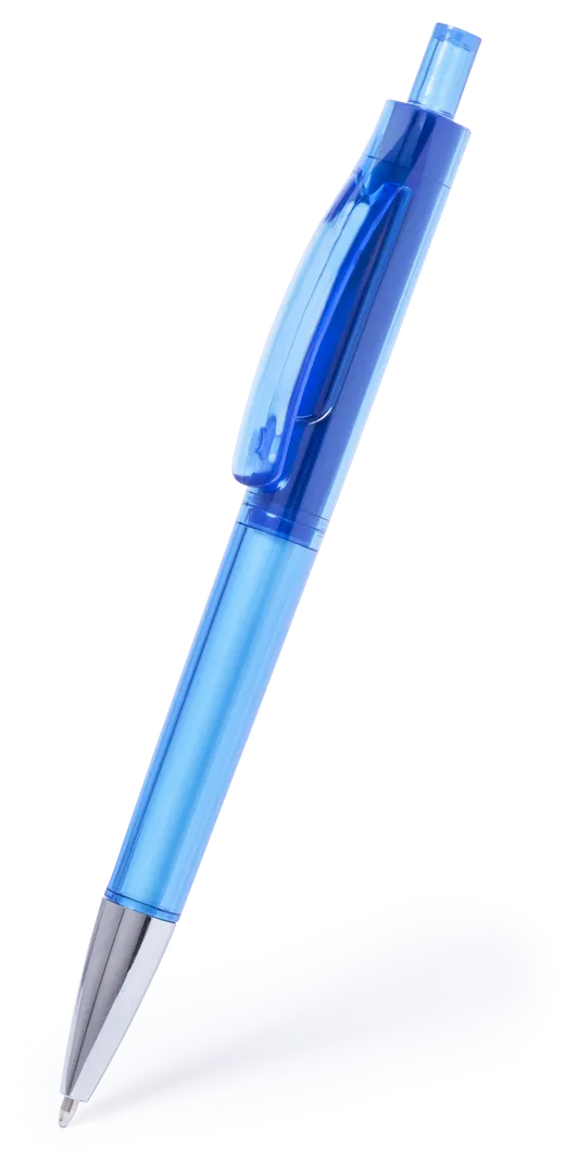 Bolígrafo de mecanismo pulsador de original diseño transparente y sólido en vivos colores y cuerpo de suave acabado. Con original clip curvado a juego y punta en acabado brillante. De cartucho jumbo y tinta azul.