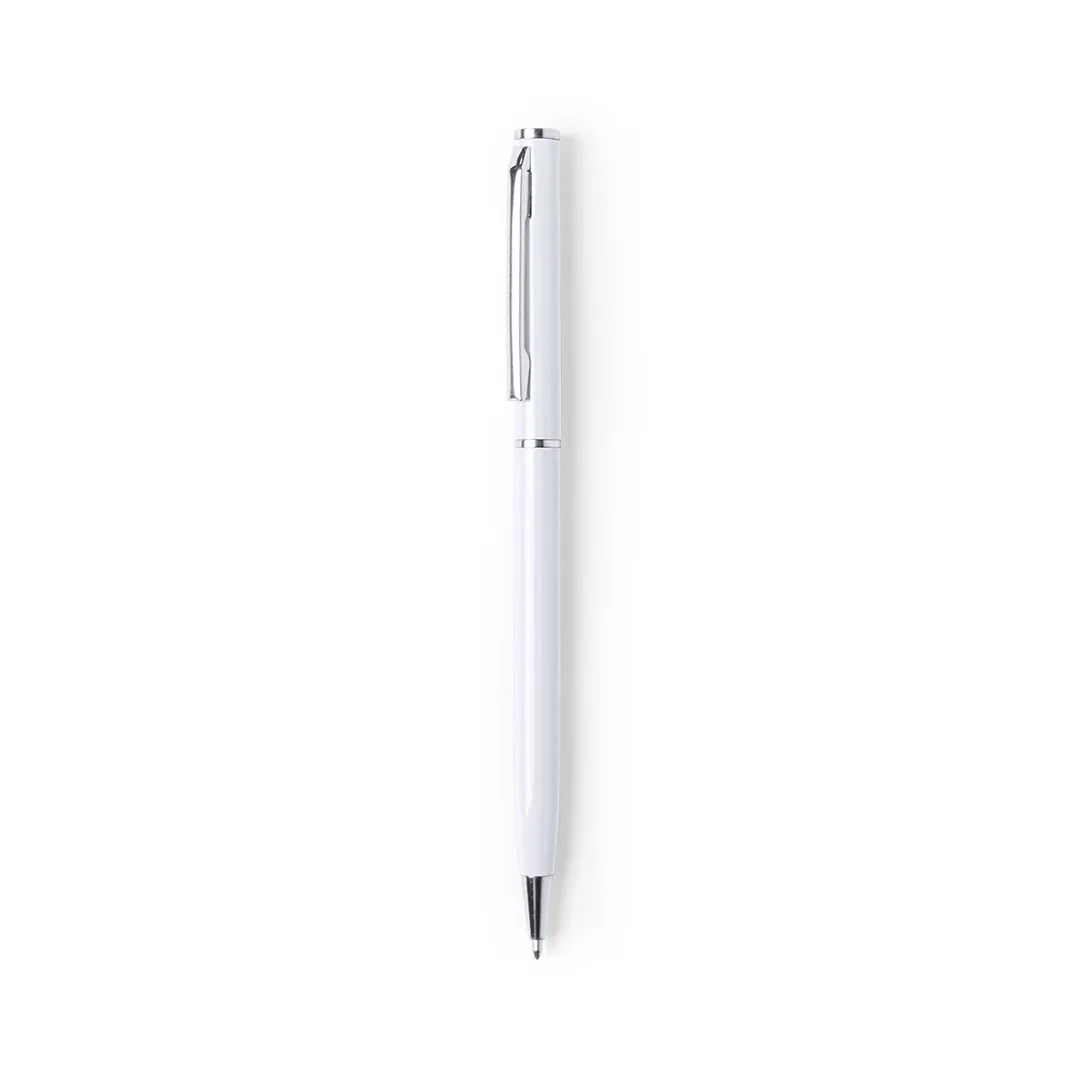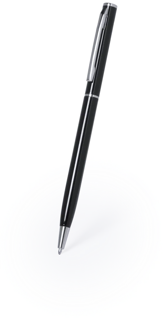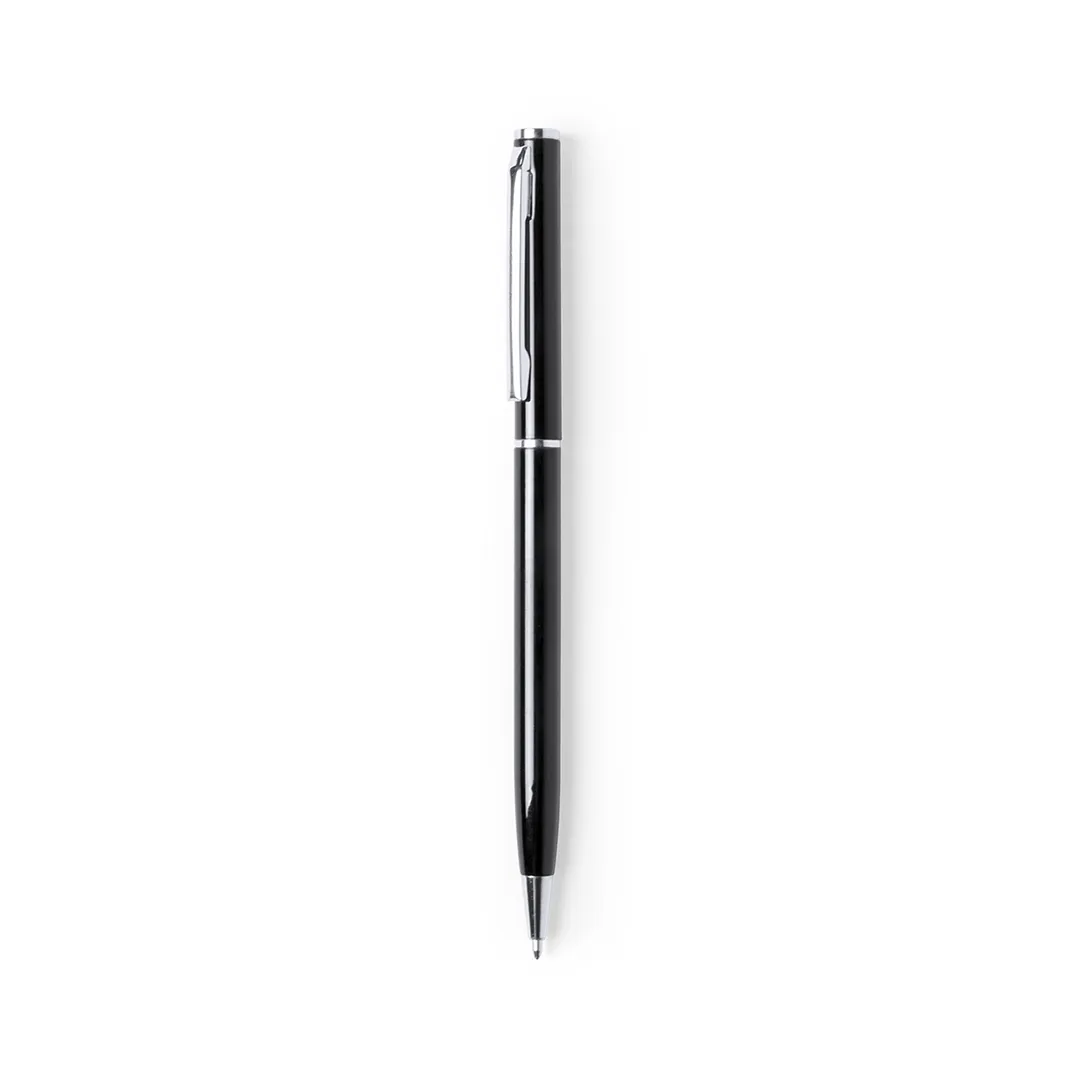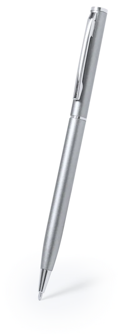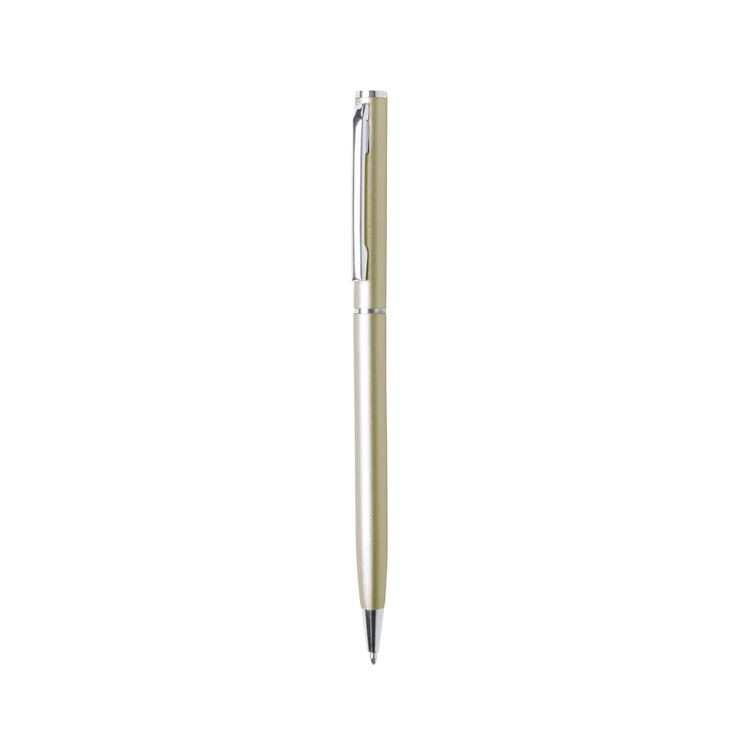 Bolígrafo fabricado en aluminio, de acabado brillo y mecanismo giratorio, con accesorios y anillas en cromado. Disponible en extensa gama de colores, con tinta azul.