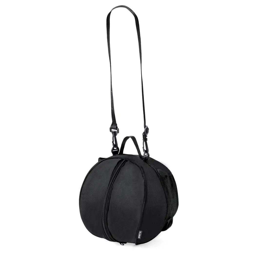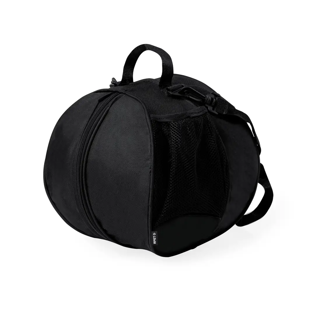 Práctica bolsa para balones fabricada en RPET. Cuenta con un compartimento central que permite guardar una pelota mediante un cierre de cremallera, siendo fácil de transportar tanto por el asa de mano como por la cinta para hombro. Además, dispone de dos bolsillos laterales de rejilla. Con logotipo RPET en etiqueta.El material RPET se elabora a partir de plástico reciclado, para así fomentar la reutilización de residuos plásticos y ayudar a la sostenibilidad del planeta.