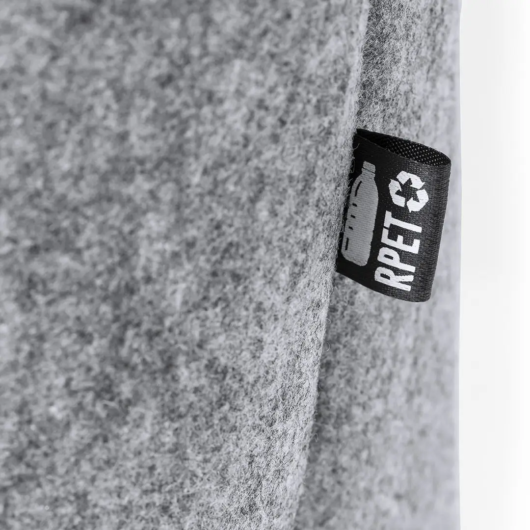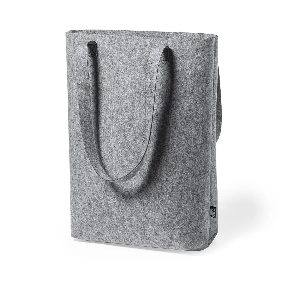 Bolsa de línea nature y en resistente fieltro RPET reciclado, fruto de la combinación del proceso de reciclaje de materiales plásticos junto con la técnica milenaria de fabricación del fieltro, dando como resultado un material de eco-tendencia que, además de ser de origen reciclado, también se convierte en reciclable. De diseño rectangular, con fuelle en la base y asas reforzadas largas (70 x 3,5 cm). Resistencia hasta 6kg, con distintivo RPET en etiqueta exterior.