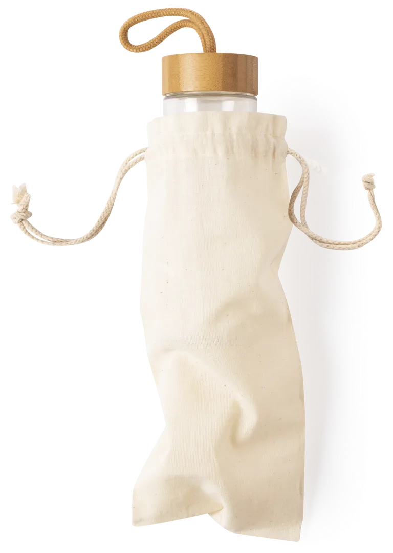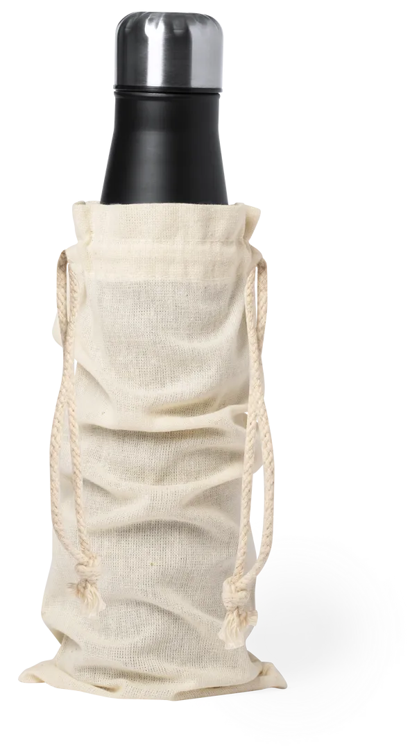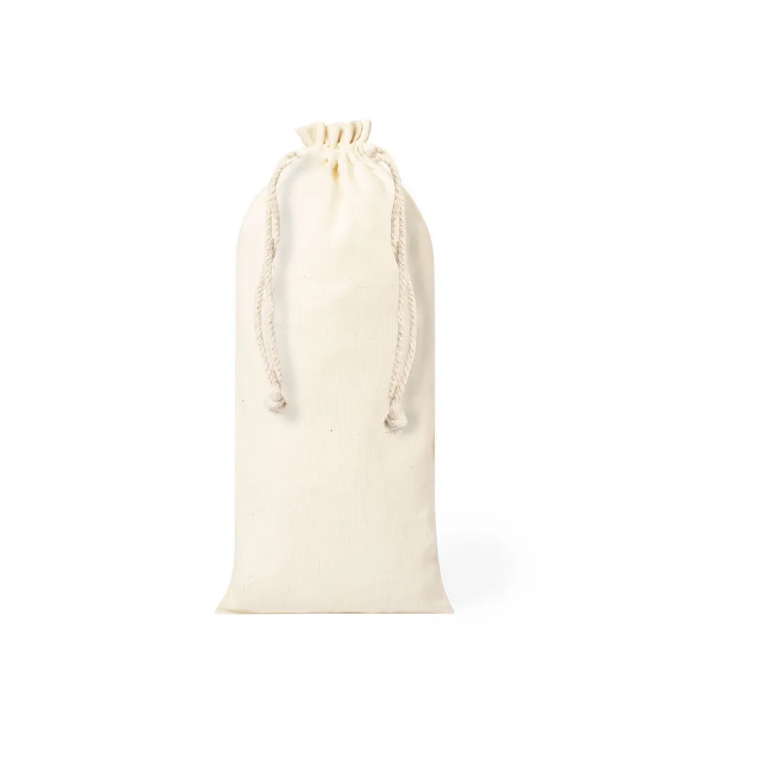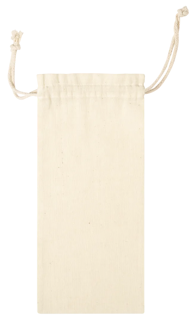 Bolsa de línea nature en material 100% algodón de 105g/m2. Tamaño 12×33 cm, de acabado cosido y con cordones autocierre de algodón. Especialmente diseñada para packaging en botellas y termos.