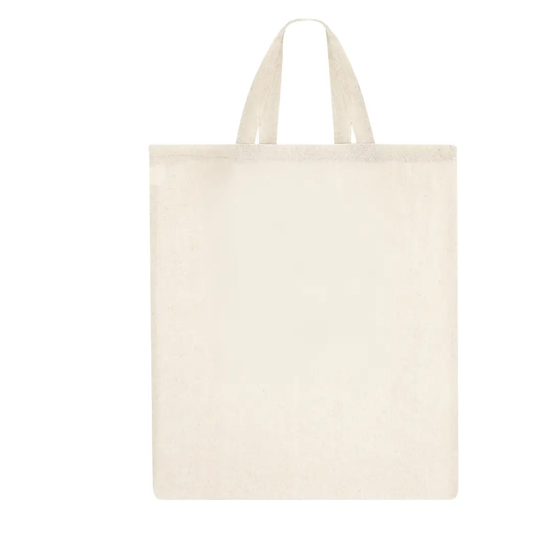 Bolsa en material 100% algodón con acabado en color natural. Con asas cortas de 35cm y acabado cosido. Resistencia hasta 7kg de peso.
