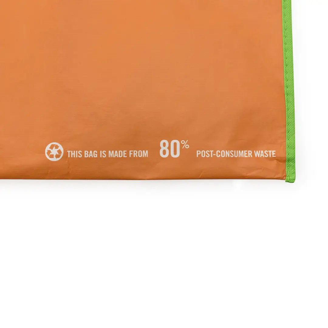 Bolsa en resistente material PET reciclado en variada gama de vivos colores brillantes. Con asas largas de 60cm en verde y reforzadas en nylon. De acabado cosido y resistencia hasta 12kg de peso.
