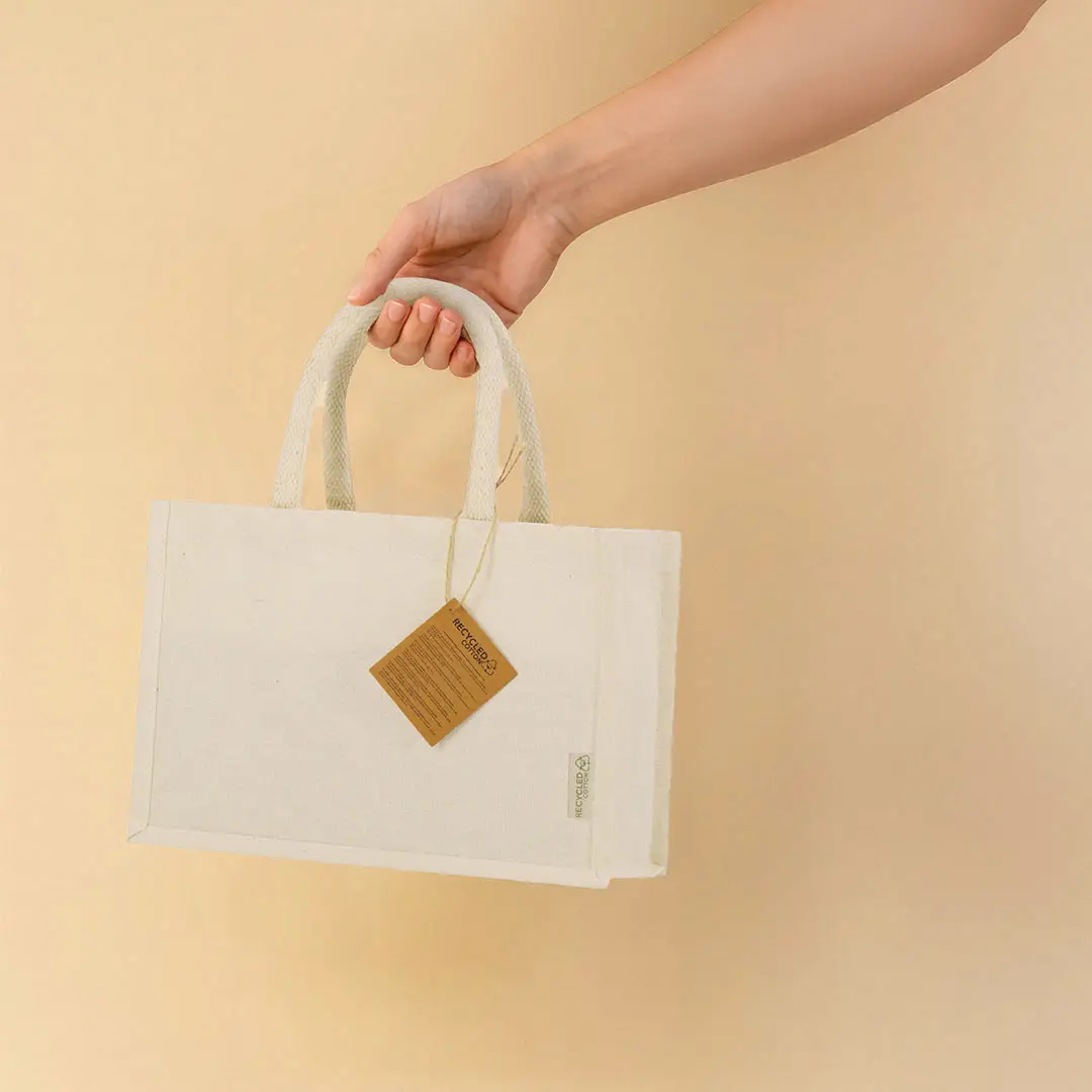Bolsa de Canvas reciclado de 220g/m2. En color natural, con resistente acabado cosido y asas redondas de algodón reforzadas de 35cm de largas. Resistencia hasta 5 kg de peso con fuelle. Presentada con etiqueta de algodón reciclado.