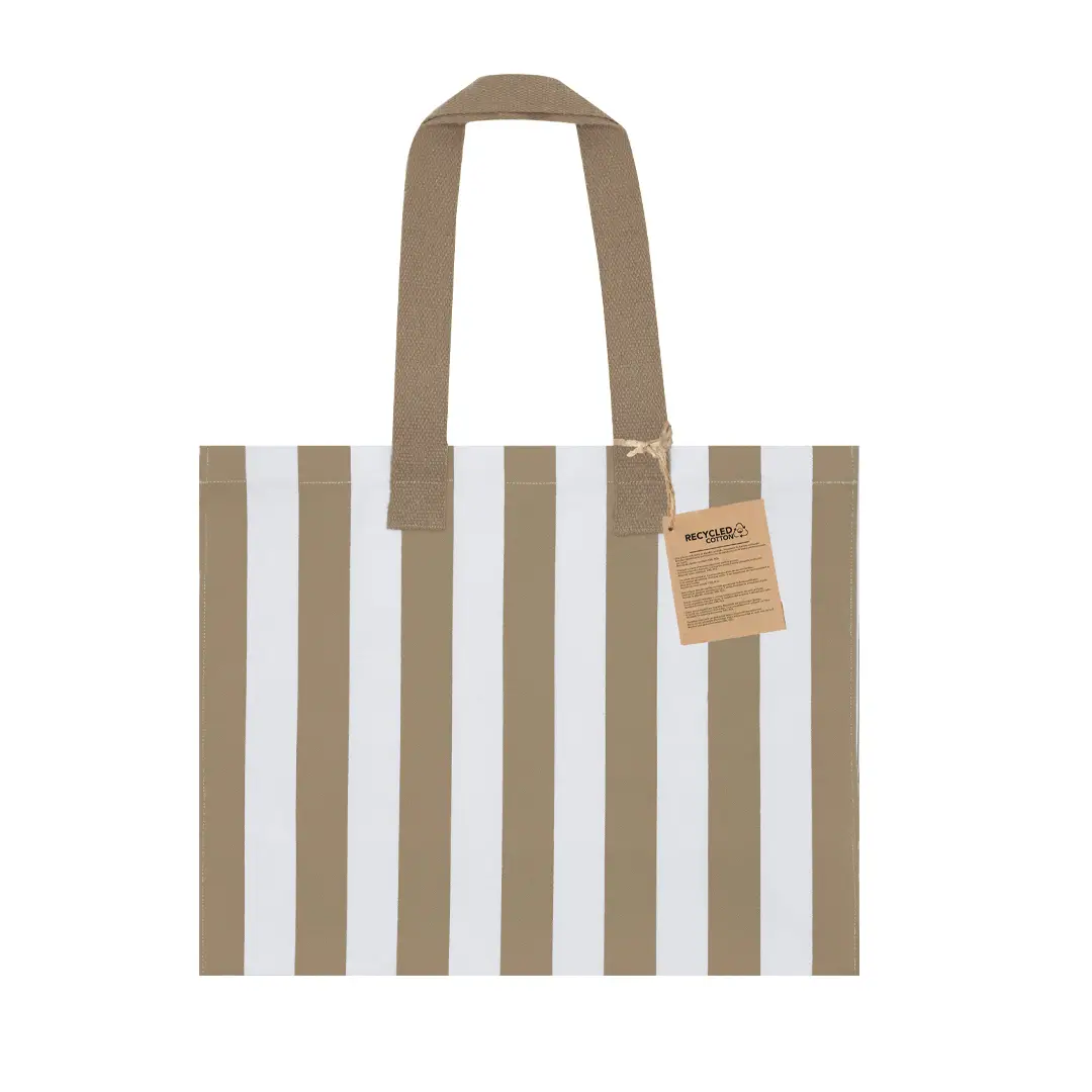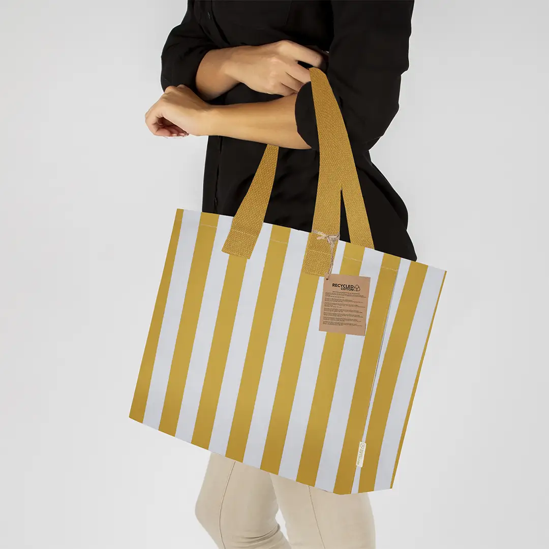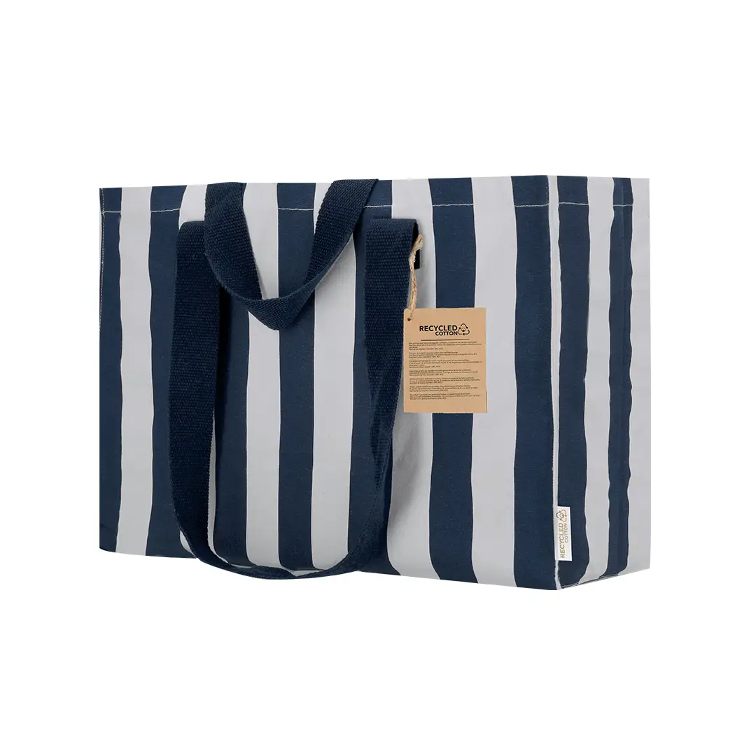 Bolsa en Algodón Reciclado de 310 g/m2. Asas largas de 70cm con refuerzo, de acabado cosido y fuelle en base y laterales. Logotipo en etiqueta lateral y resistencia hasta 10 kg de peso. Con diseño a rayas verticales blancas intercaladas con color.