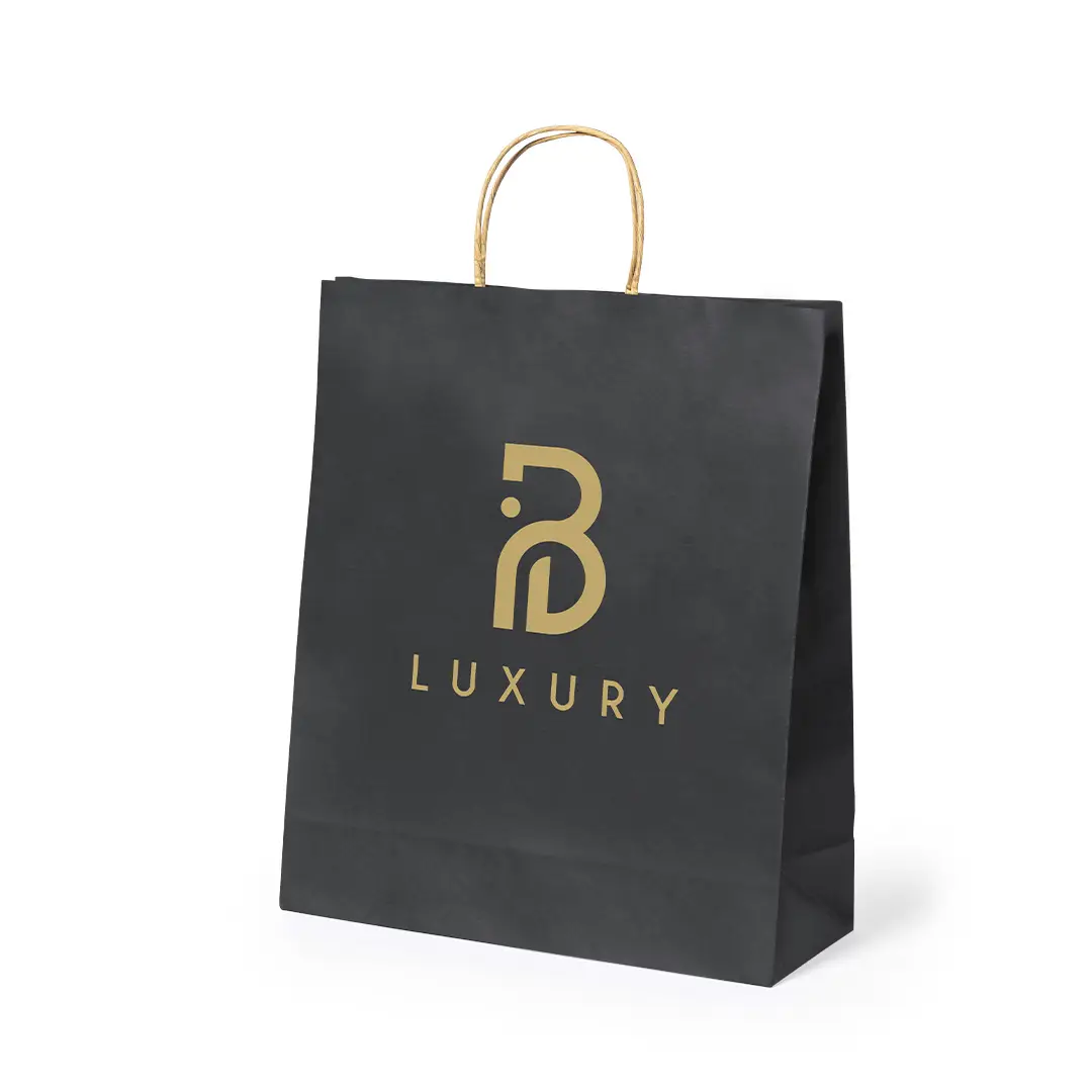 Bolsa de línea nature, fabricada en papel reciclado acabado en negro de 100g/m2, con asas cortas reforzadas en tono natural y fuelle. Resistencia hasta 8 kg de peso.